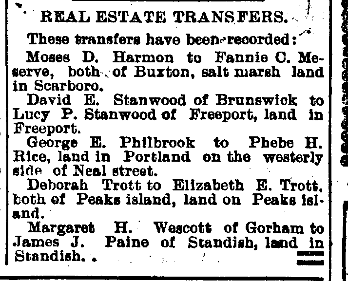 104 Neal St_Portland_daily_press_1897-12-15_4 ← Previous Next → Clipping from the December 12, 1897 Portland Daily Press noting the sale of 104 Neal Street to Phebe Rich. Newspapers.com