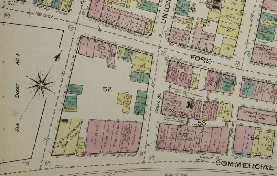 12 O’Brion Sanborn 1886 ← Previous Next → Charles Stanwood’s shipsmith shop at the corner of Commercial and Cross Streets 1886. Library of Congress