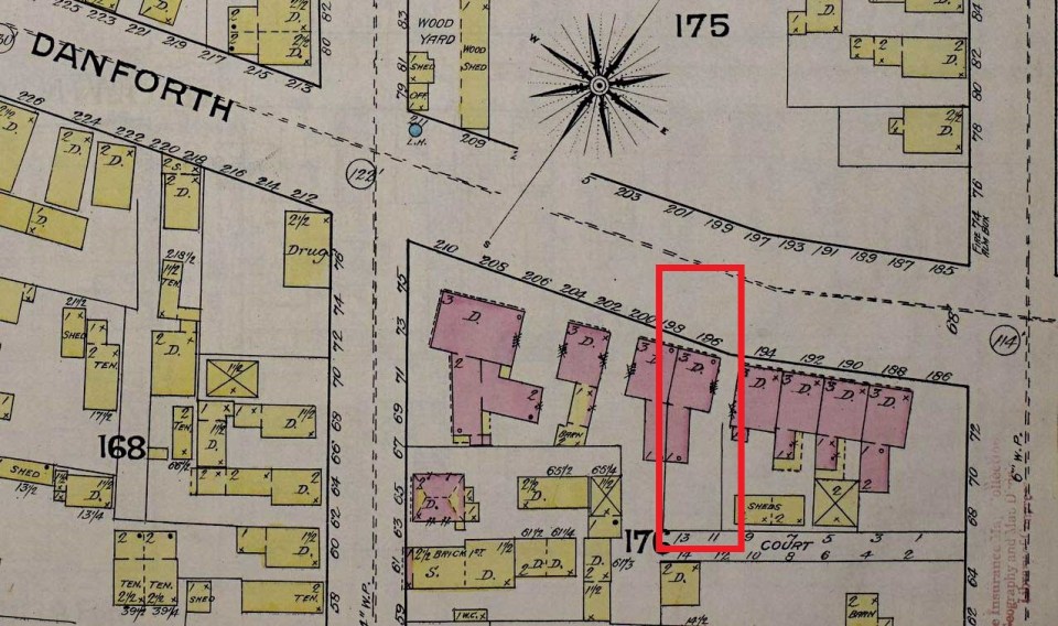 196 Danforth 1886 Sanborn ← Previous Next → 196 Danforth Street on the Sanborn Insurance map of 1886. Library of Congress.