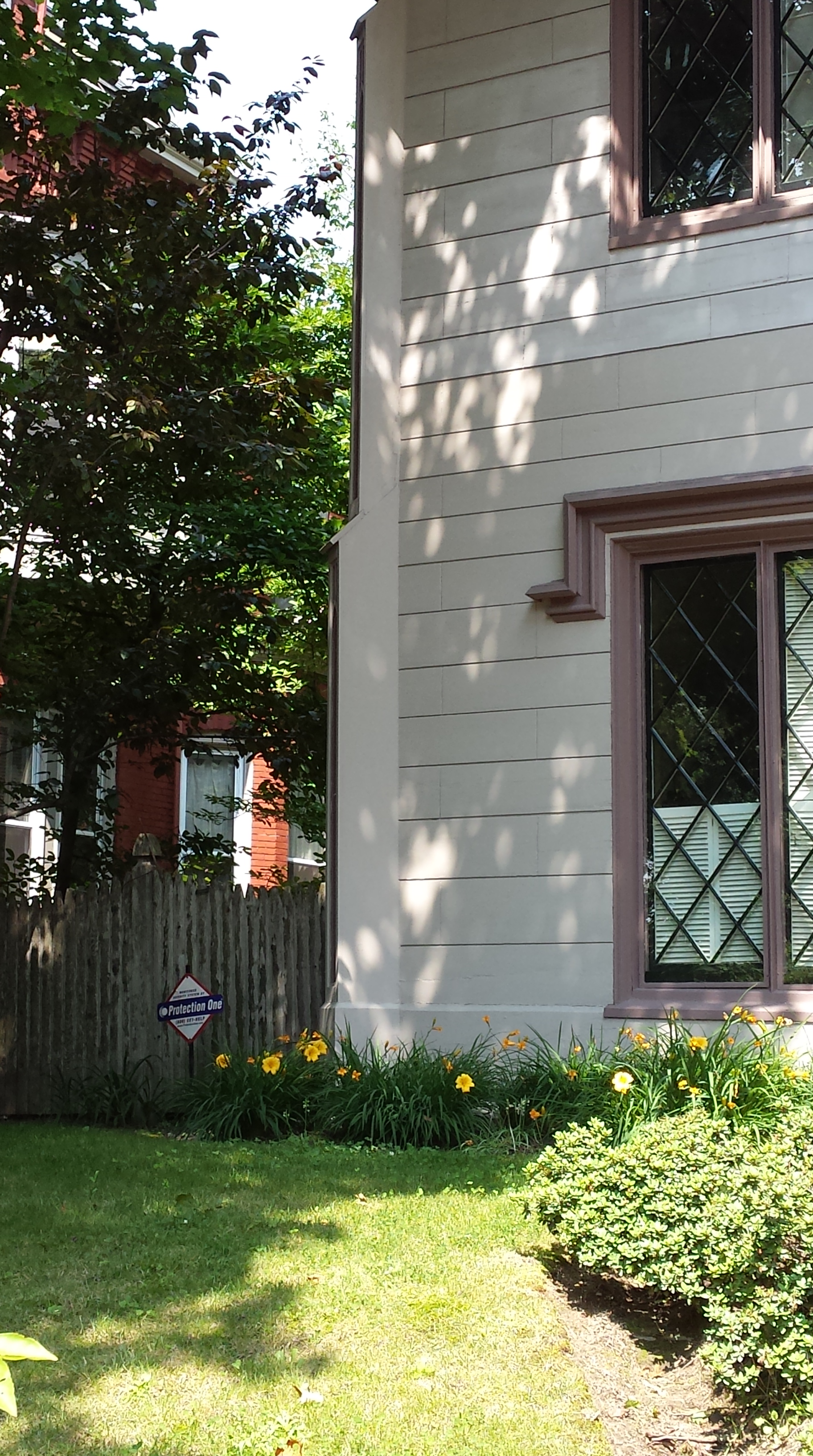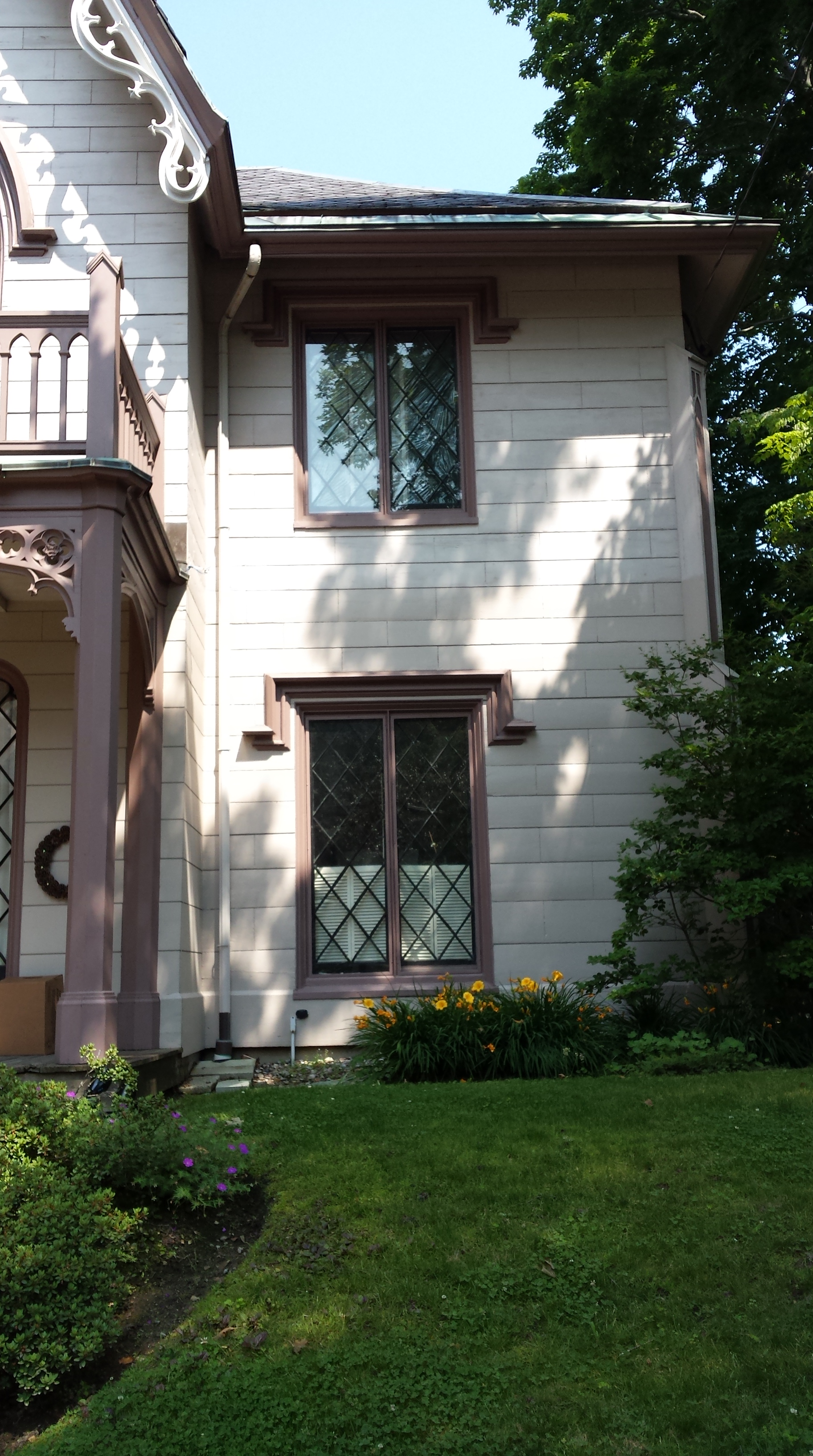 387 Spring Street was built in 1845 from designs provided by Henry Rowe. A small balanced structure, it could easily have been taken from the pages of Downing. The boards of the siding have been finished to look like stonework. Most likely, the original paint would have had sand added to increase the stone effect.