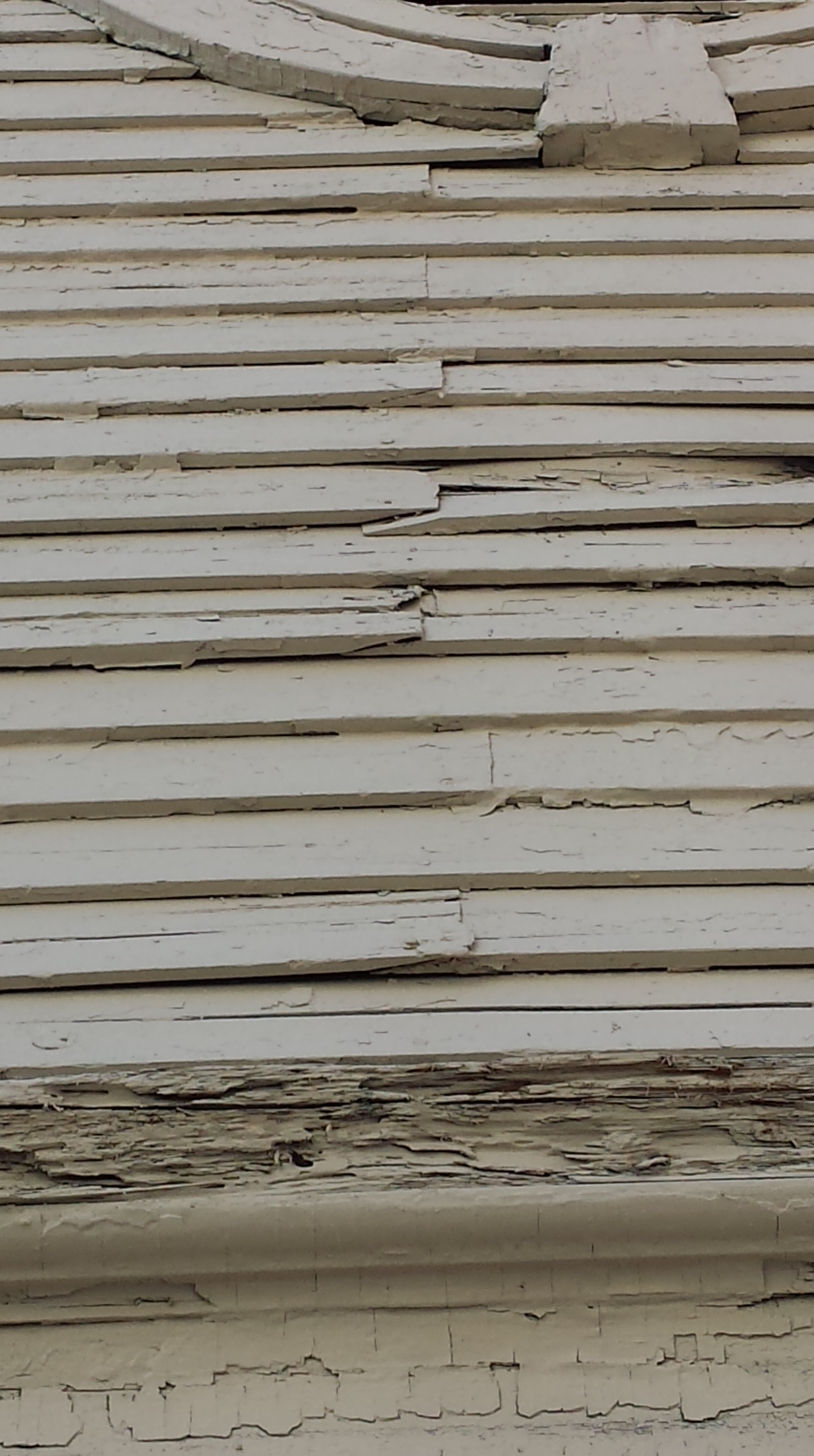 The siding, however dilapidated, tells a story on the age as well. The front shows a ‘lapped’ siding that, when painted properly, would have reproduced the look of stone. The end wall is covered in clapboards with a tight exposure and overlapped, or ‘skyved’, joints. Modern joinery uses a flat or ‘butt’ joint which tends to open and close with changes in weather. The skyved joint will move with the weather but, being overlapped, will not open up.