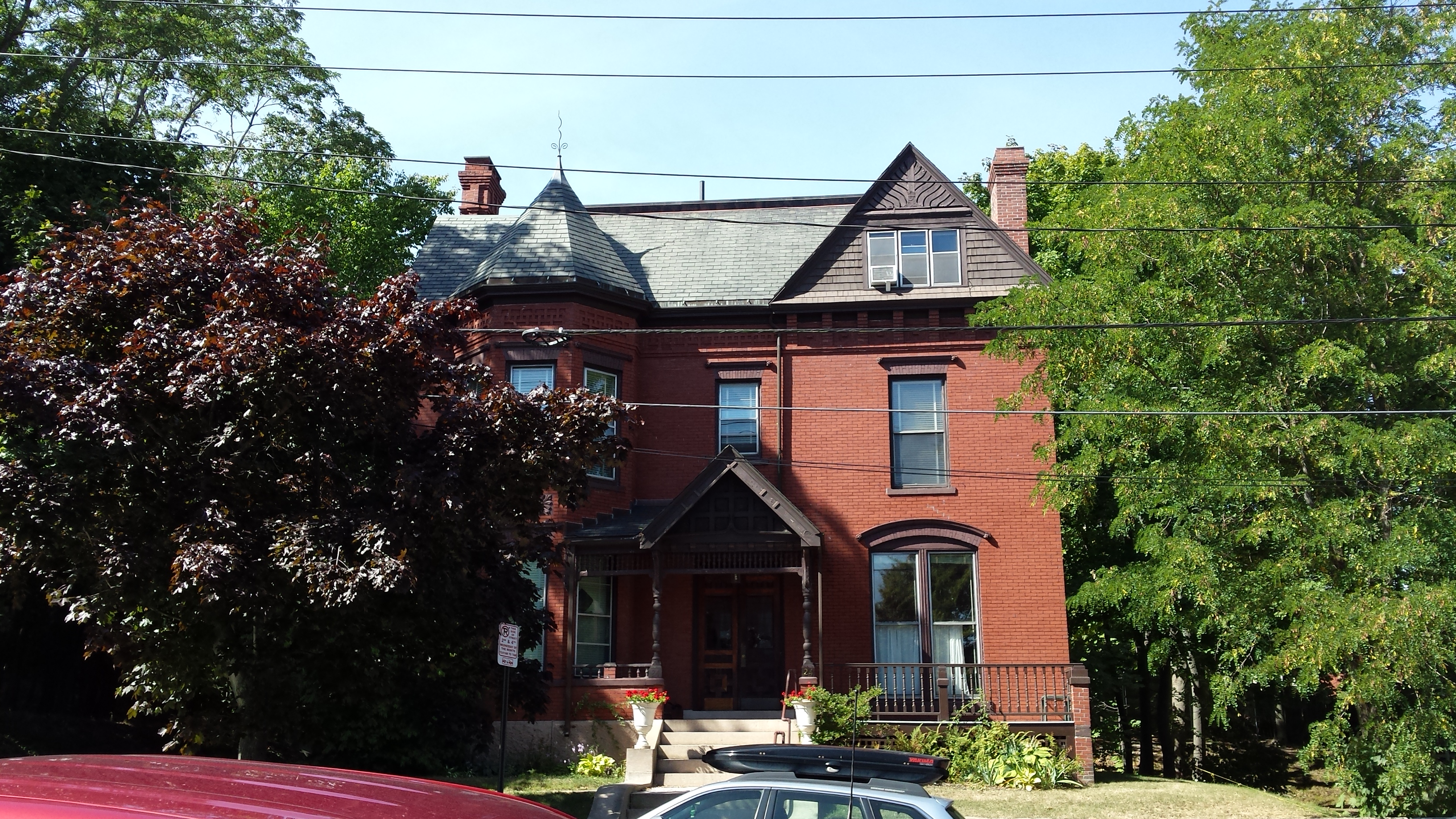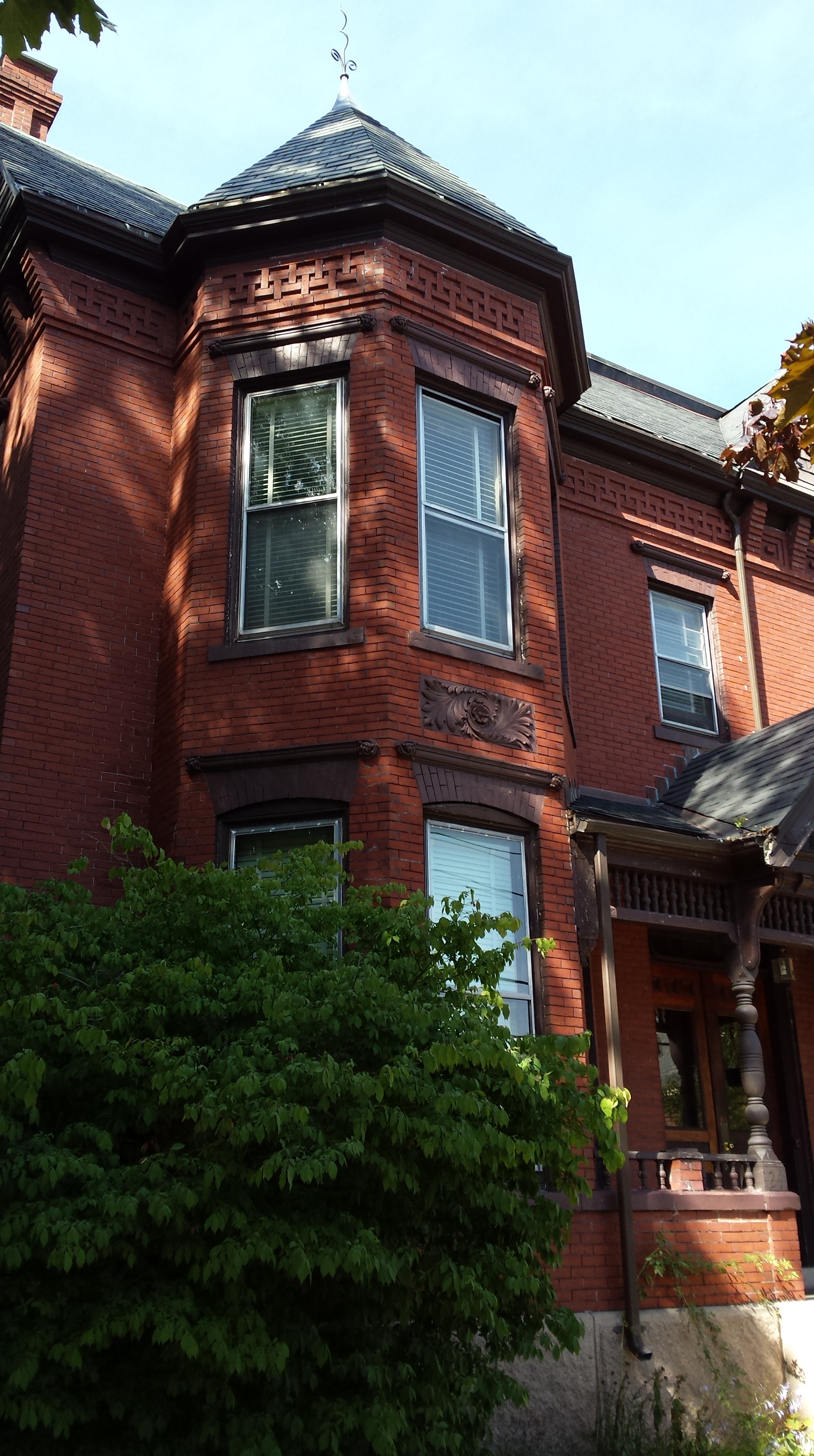 The building is a rather tall block with some common Queen Anne features. The height is emphasized by the house’s placement on a steeply sloped street. It’s executed in brick with wood and brownstone trim. It is a form and style Fassett knew well and used to great effect in many places. For a couple of reasons, I don’t think this is one.