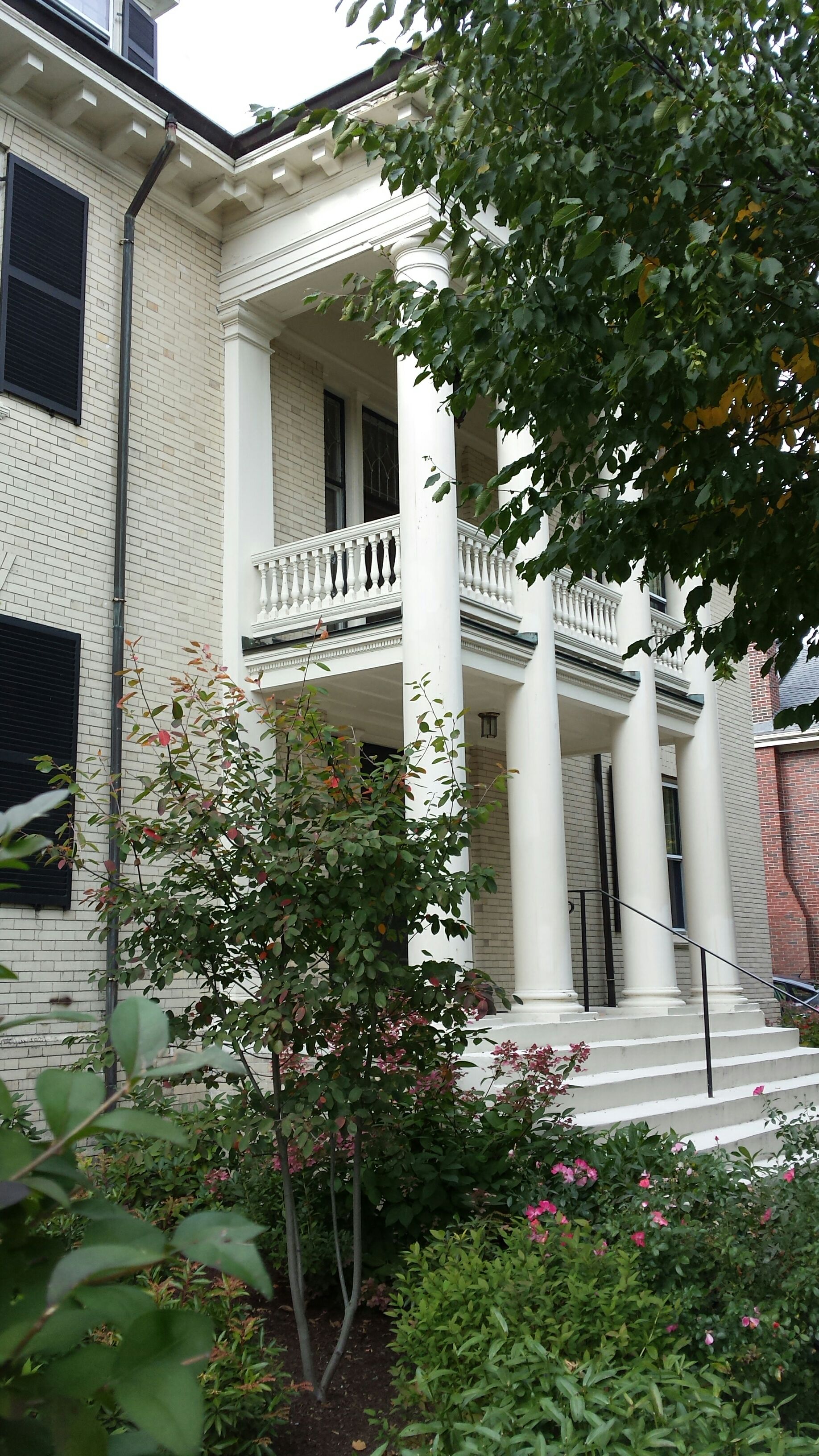 The porch is quite large for the building’s size and is dominated by 4 Doric columns that extend the full 2 stories. They are a bit overscaled but are well detailed. The outer columns are matched by pilasters on the body of the house. The entryway itself is unadorned and subordinate to the columns of the porch.