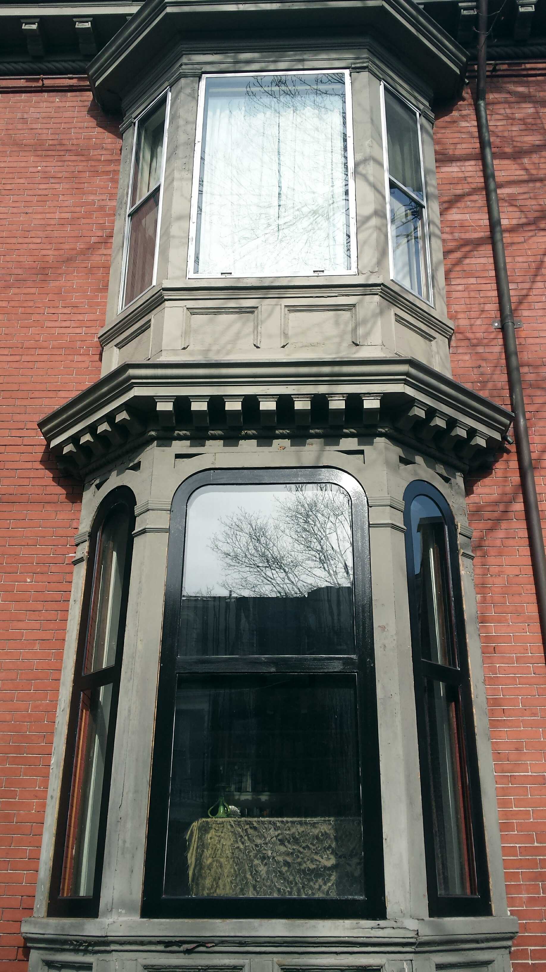 The bay windows are very straightforward. Large central panels with very discreet curves at the upper corners. Very fine band moldings mark the spring points of the arch tops. The dentils are quite heavy and far too numerous.