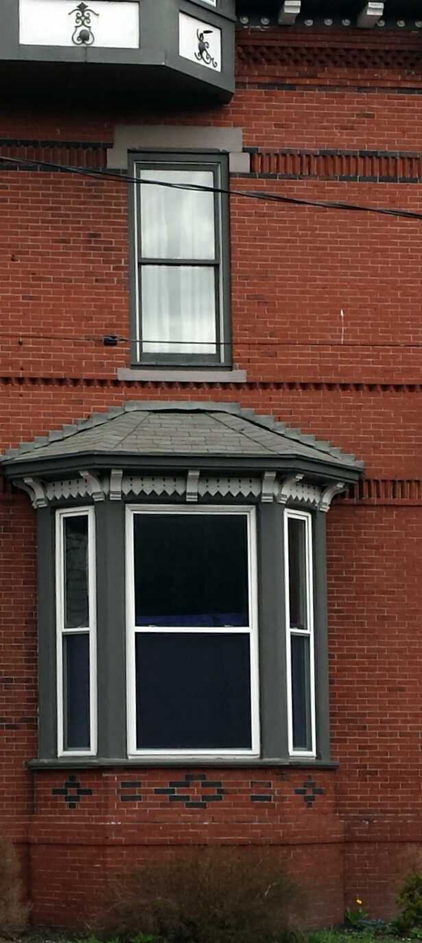 Beginning with a discreet water table, we progress upwards we have overfired bricks in a geometric pattern on the bay. At the first-floor ceiling line is a band of bricks in a vertical saw-tooth pattern contained in with soldier courses. The beltline is a minimal saw tooth pattern made with the headers of the bricks. There is a repeated ceiling band. This time the soldier courses are of overfired brick. Finally, we have a stud pattern on the frieze. The third-story windows in the middle of the roof lines are a Fassett ‘signature’ but not usually this bulky. They are in the 1924 photo but I am not sure if they are original