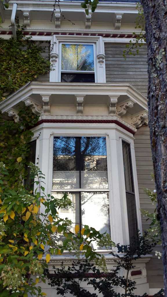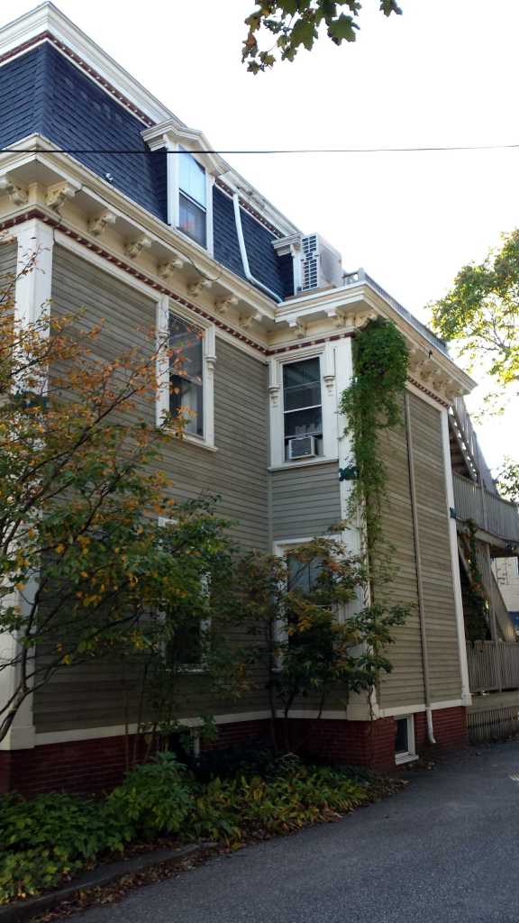 The form is fairly common. 3 bays wide and deep, 2 stories with a third under the mansard. The rearmost bay projects about 4′ from the structure on both sides of the building. There is a rear service ‘ell’ that is almost as wide as the main block. Details are for the most part common for Mansard houses in the square-cornered bay window and round-topped dormers. There are some very unique features which we will look at further on.