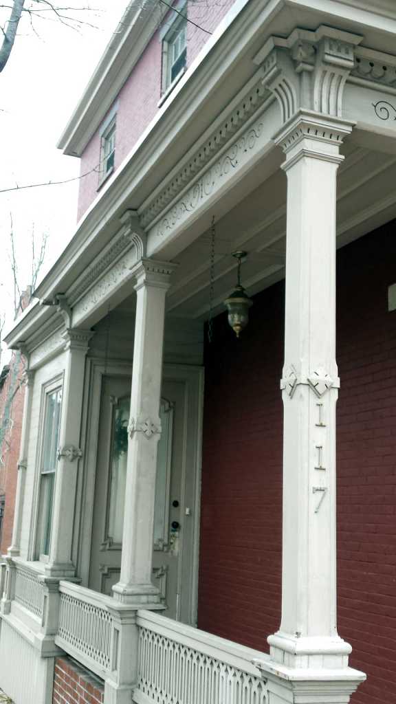 As mentioned previously, the porch parallelling Spring Street has details that place in a later time period than the house. The railing is in a ‘gingerbread’ pattern and supports square columns with chamfered edges. The columns have a banding detail with quatrefoil bosses. The capitals are compound and break into brackets with vertical incised bands. These support a frieze with delicate, maybe too delicate, scrollwork. Above this is a modified egg and dart molding that leads to a mildly projecting cornice.