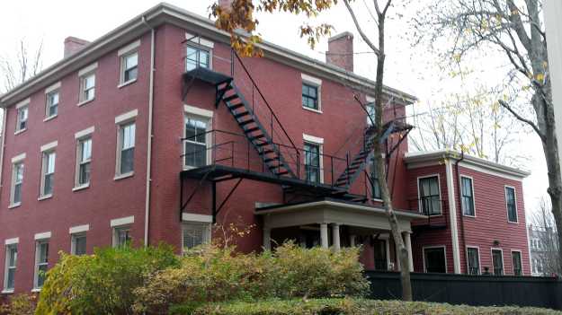 Eastern portico showing rear ell. The fire escape was added when the house was a dorm for the Maine College of Art.