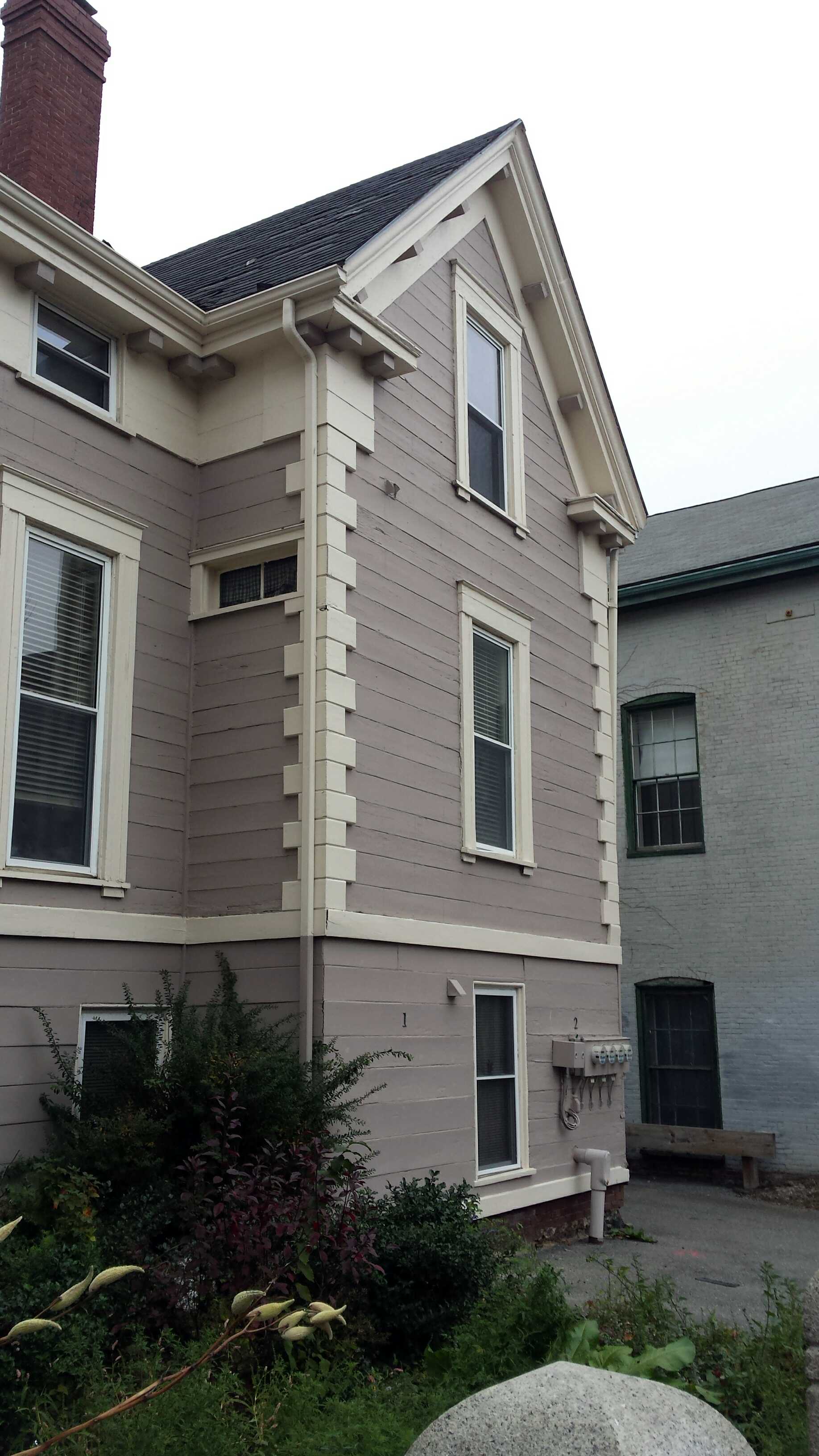 The gable ends have an interesting projecting bay that is square in plan and only 2 stories tall. The Spring Street side gives a good view of the narrowness of the first-floor windows. A note on the siding. I suspect the intention was to mimic stone by having the boards joined tightly or ‘matched’. It would then be covered with somewhat heavy paint that would have sand incorporated to increase the effect of stone. A wonderful effect but one that requires allot of maintenance to keep up.