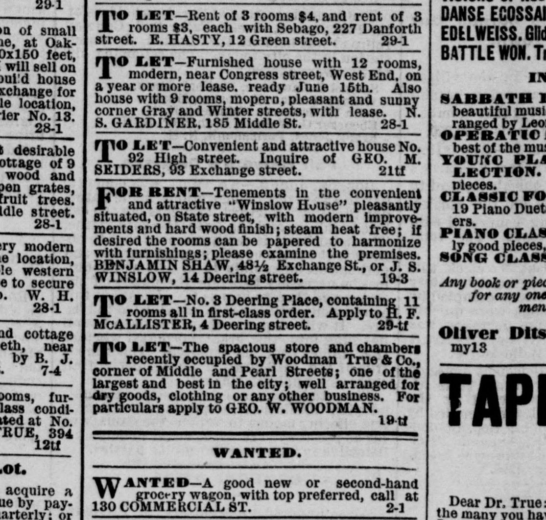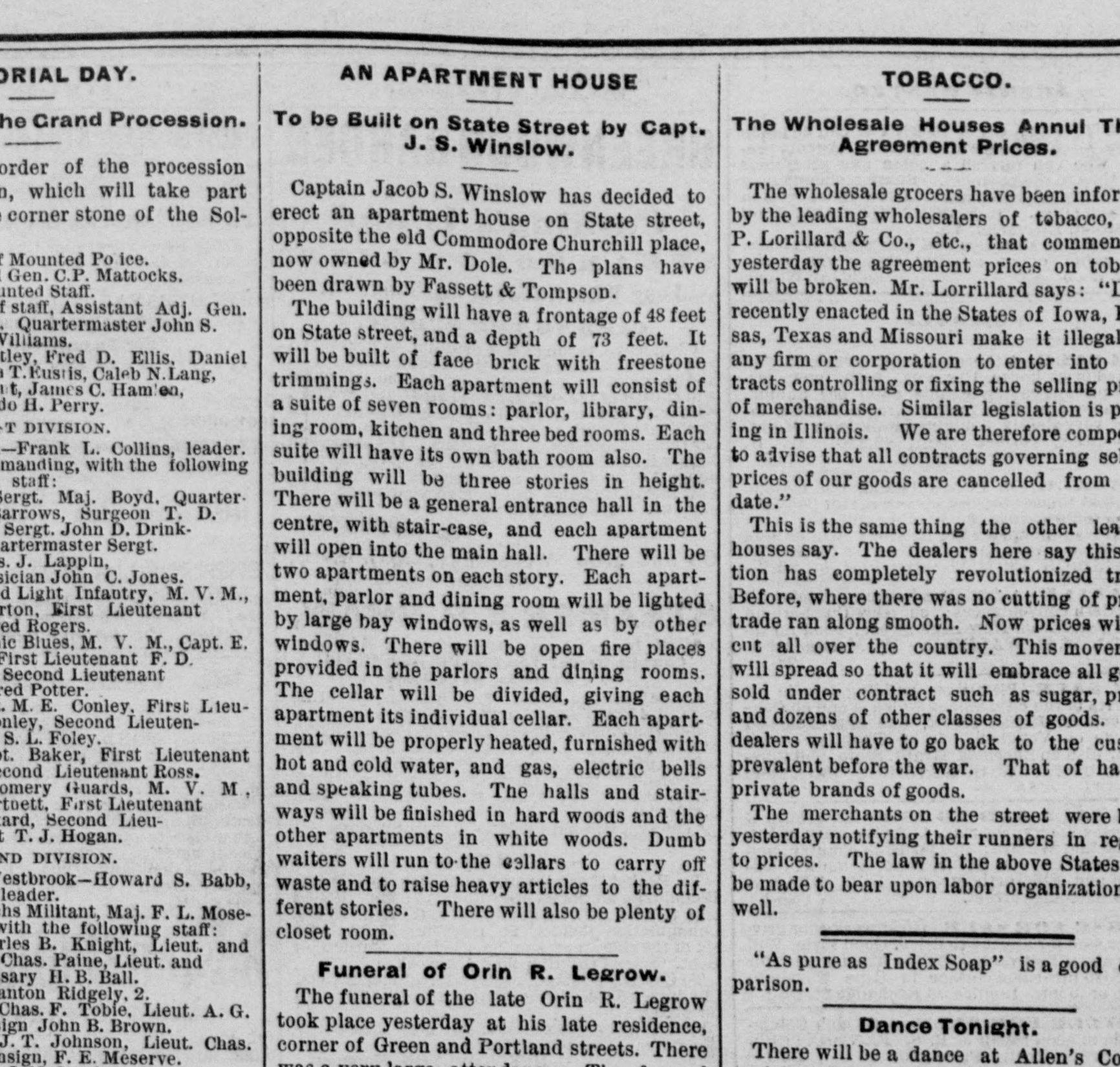 12.23.2020. Many thanks to reader Alex, owner of the Jacob Winslow house, for sending me the images below from the Portland Daily Press confirming my hunch of Francis Fassett as the designer of our subject. I am especially excited to see the detailed description of the layout and amenities included. the second image is a listing for the rental of one of the units. Sounds like they were pretty nice. And they would ‘paper to suit’.