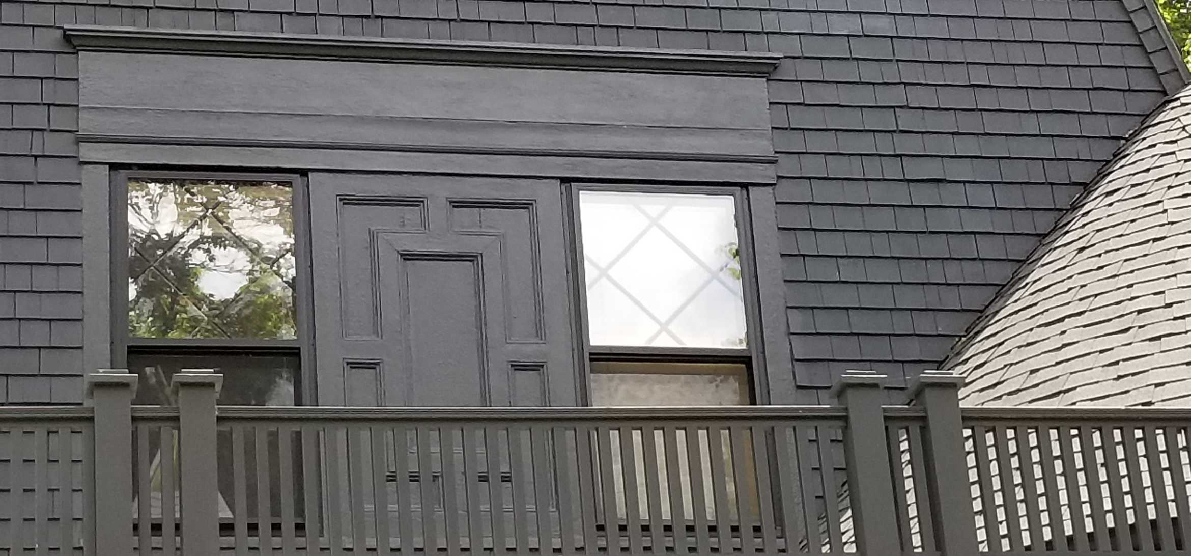 A view of the Colonial Revival-inspired panel work on the second floor. Note the diamond form window.