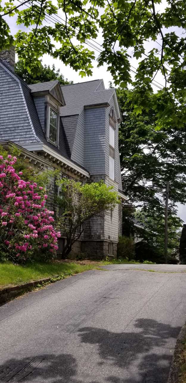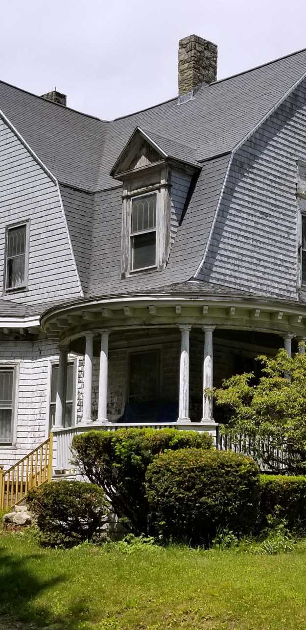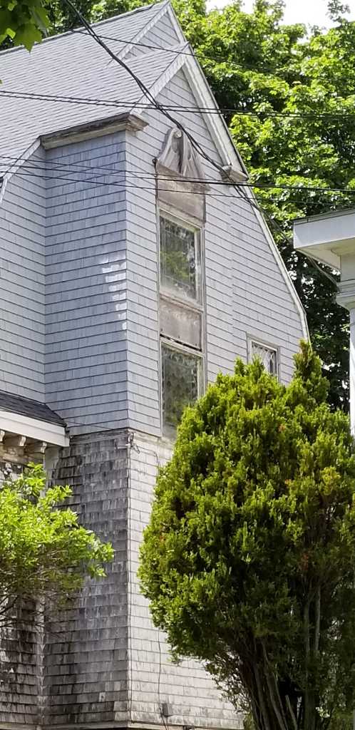 Contemporary to 126, our subject house shows similar stylistic elements. Overall it’s Queen Anne in style and form with some Colonial Revival details. The plan is cruciform with the primary axis running perpendicular to William Street. This axis ends in a powerful gambrelled gable. The placement of the house on a raised lot increases the effect of the gabel’s size.