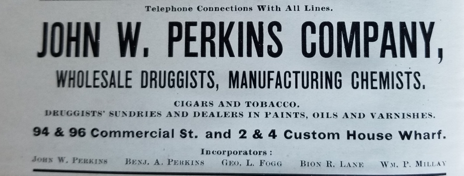 It didn’t last long. Charles Stanley died in 1893. Sumner continued on until his passing in 1906. His will passed our subject to George Fogg who was Sumner’s nephew by his sister Arabella. George was born in 1855. He married Octavia Roach, who was a little less than a year younger, in 1877. George had worked his way up through the ranks at John W Perkins’ wholesale drug business in Portland. By 1910 was a partner and was included in the company’s ad in the city directory for that year.