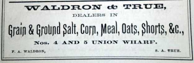 Francis founded Waldron and True with Samuel True sometime after 1859 and had seen great success. They ran a grist mill at Stroudwater and had warehouses and offices on Union Wharf. In the early 1880s, Waldron and True broke up with both continuing to trade in grain, etc but out of different locations. By the 1890s, Francis’ son Flavel had joined with his father in FA Waldron and Son on Union Wharf.