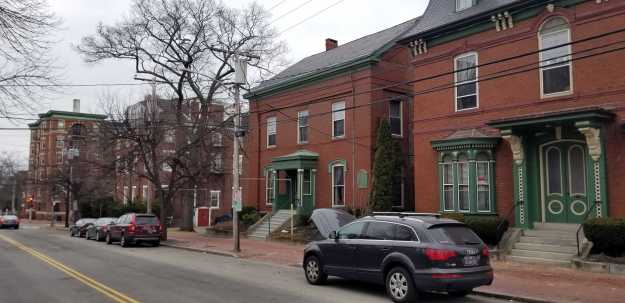 A brick Greek Revival between State and Brackett Streets.