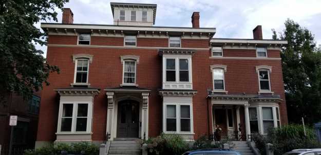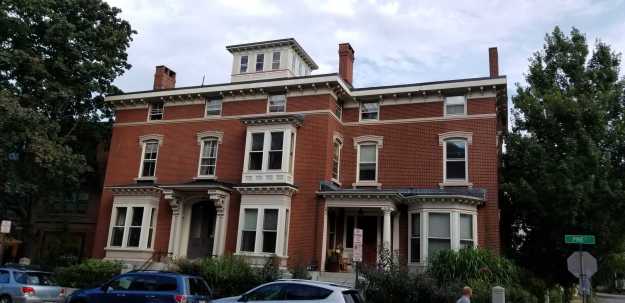 A large brick Italianate on the corner of Pine and Lewis Streets.