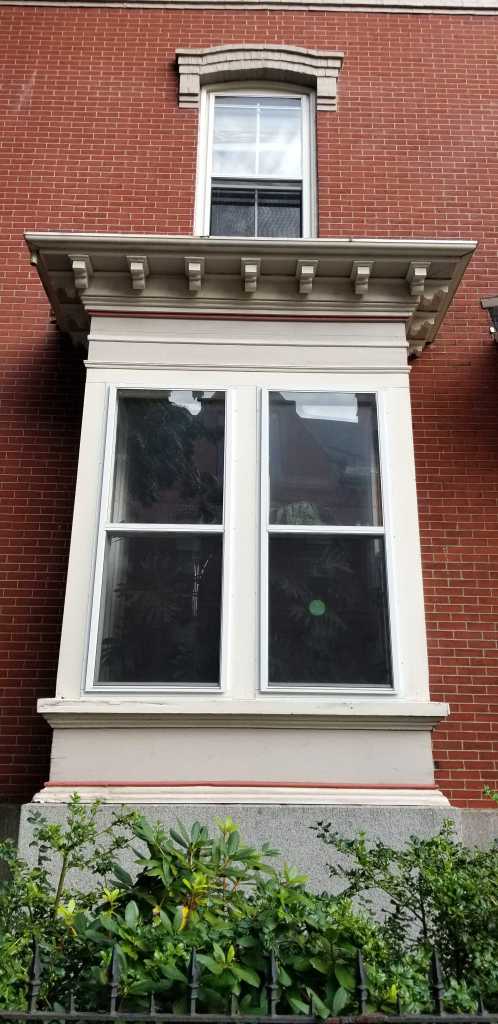 Then we have the bay windows. The sketch from Elwell’s Portland and Vicinity shows a pair of square bays on the first floor with no other bays visible. As part of the 1895 remodel, a single square bay replaced the right-hand window of the second floor. This bay is more detailed in its paneling than the bays of the first floor. There was no bay added on the left of the second floor to balance the right-hand side. On the new section, a clipped corner or rounded bay was placed on the first floor thus adding to the overall imbalanced feel of the facade.