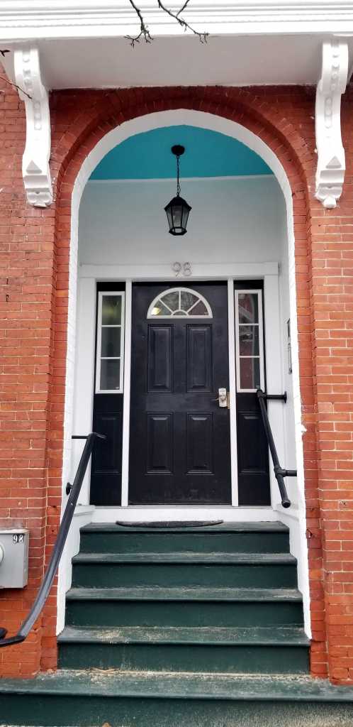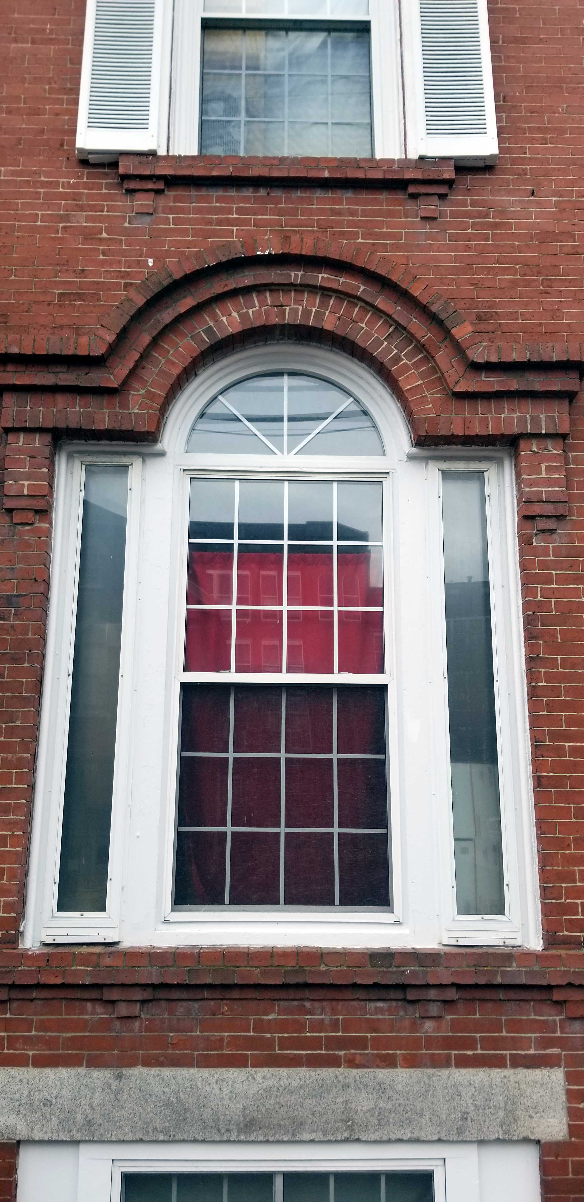 The first-floor windows are of note. Palladian windows that are a bit too tall for their width are set on and surrounded by frames and ornate hoods of brick. The entries are recessed behind an arch. They are covered by bracketed roofs. The doors are modern and are side-lit. The ceilings of the recesses are painted a pleasant blue and have hanging lamps in a period style.
