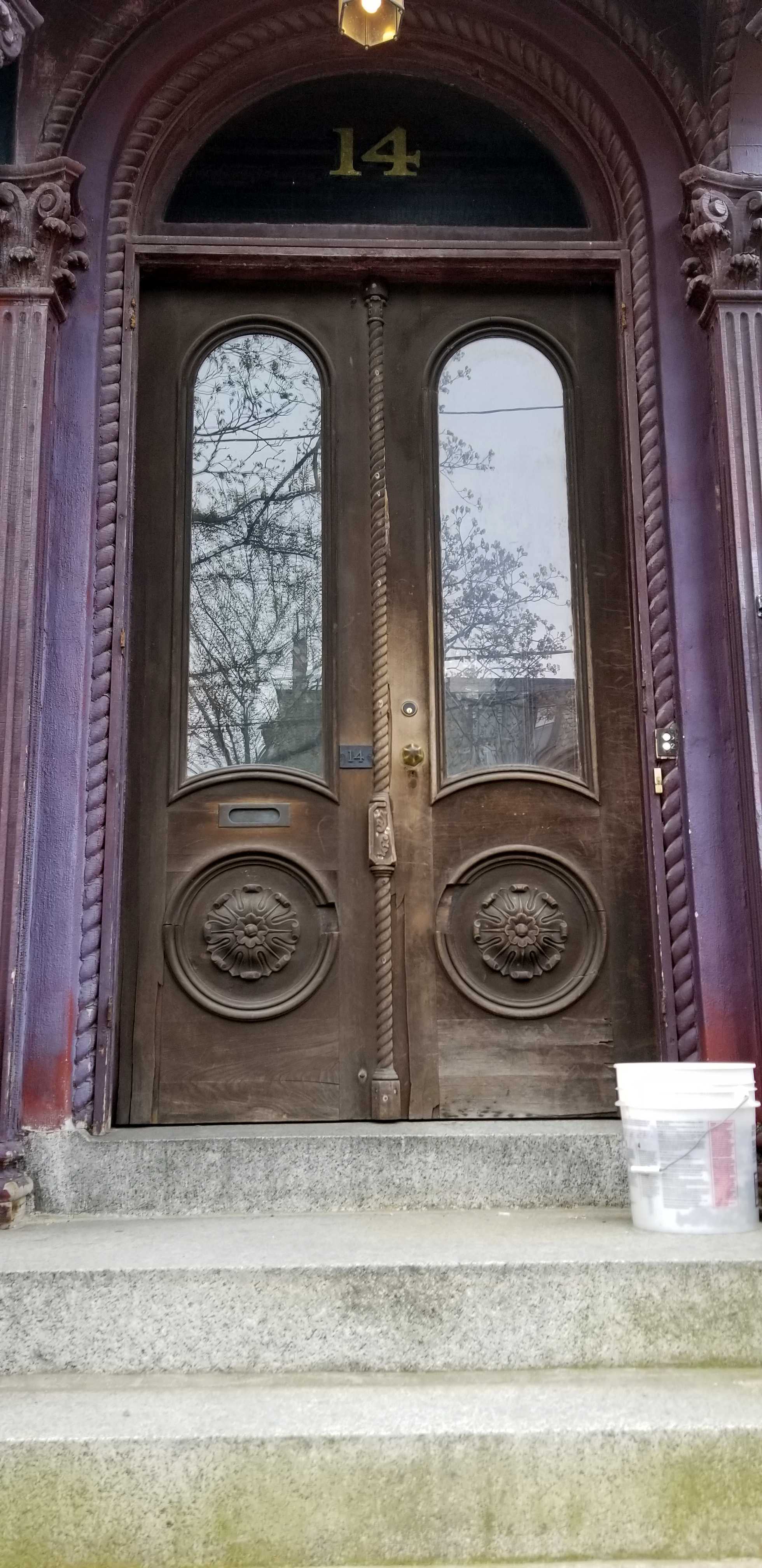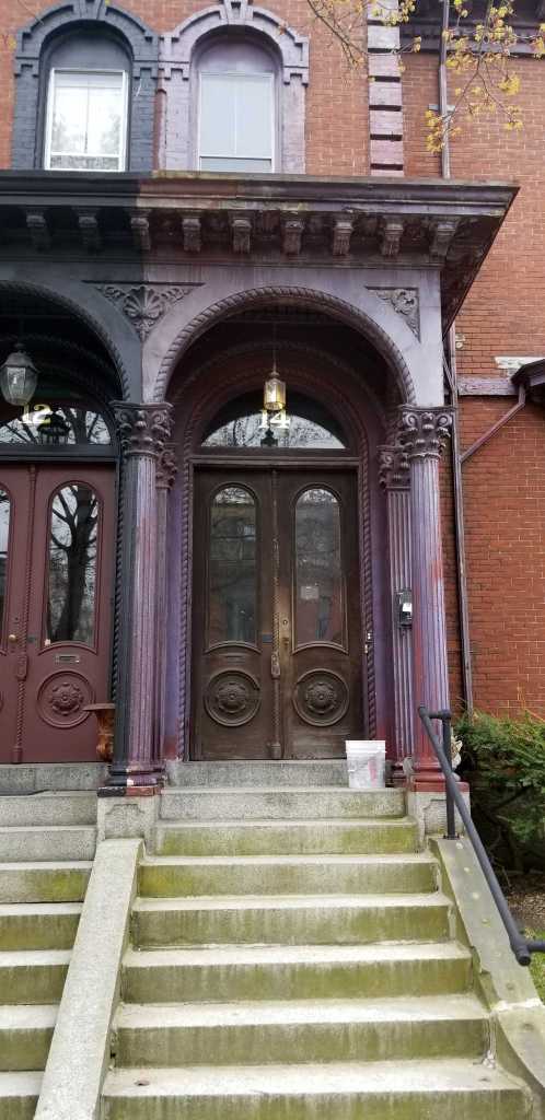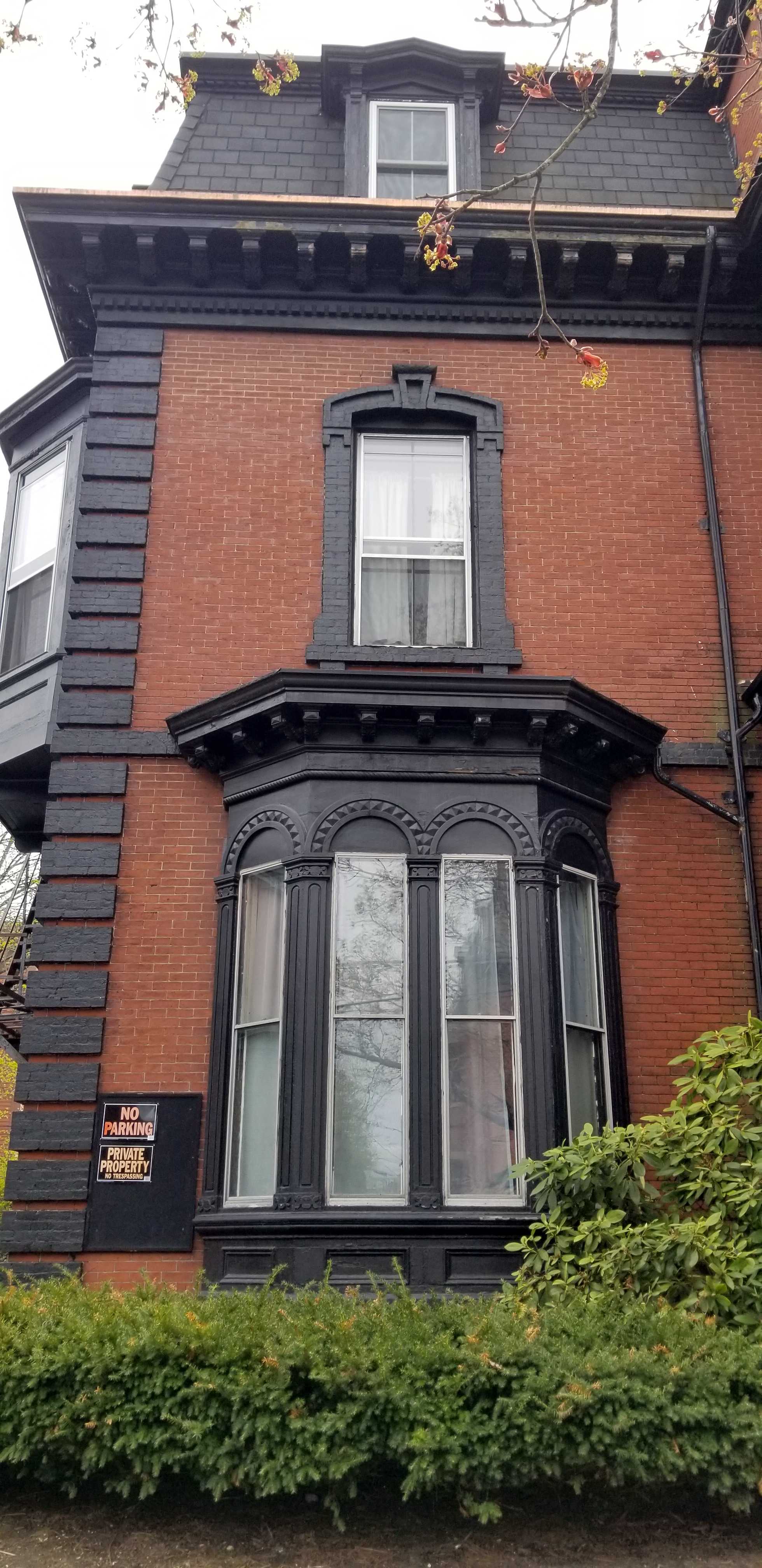 Although the main façade is rigidly symmetrical, each half of the building is a unique unit. This is immediately noticed when you look at either sidewall. The ‘Lewis’ side at #12 is notable for the second-story bay window and stacked bay windows beyond. The details of the façade are carried through this wall. The bays on the second story are much simpler in design than the first. The windows are surrounded by hefty brick frames on a corbeled sill. The frames are hooded with insets and grand keystones.