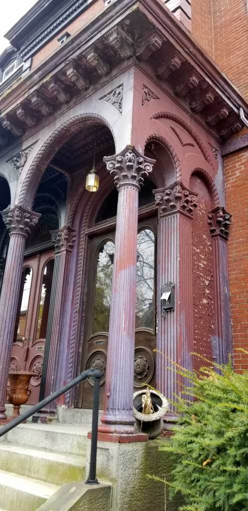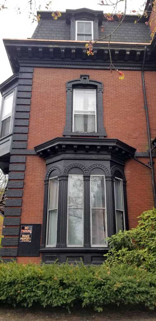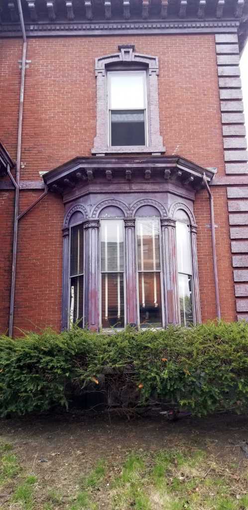 The service ell at the rear is a two-story block with all the details of the main block. It also shows the variations in each unit. The differing roof lines on the lowest segment of the mansard are interesting. I believe the right-hand unit shows the original line. The left side shows the changes, remuddling, done when the unit was converted for use as a home and doctor’s office. More on that later.