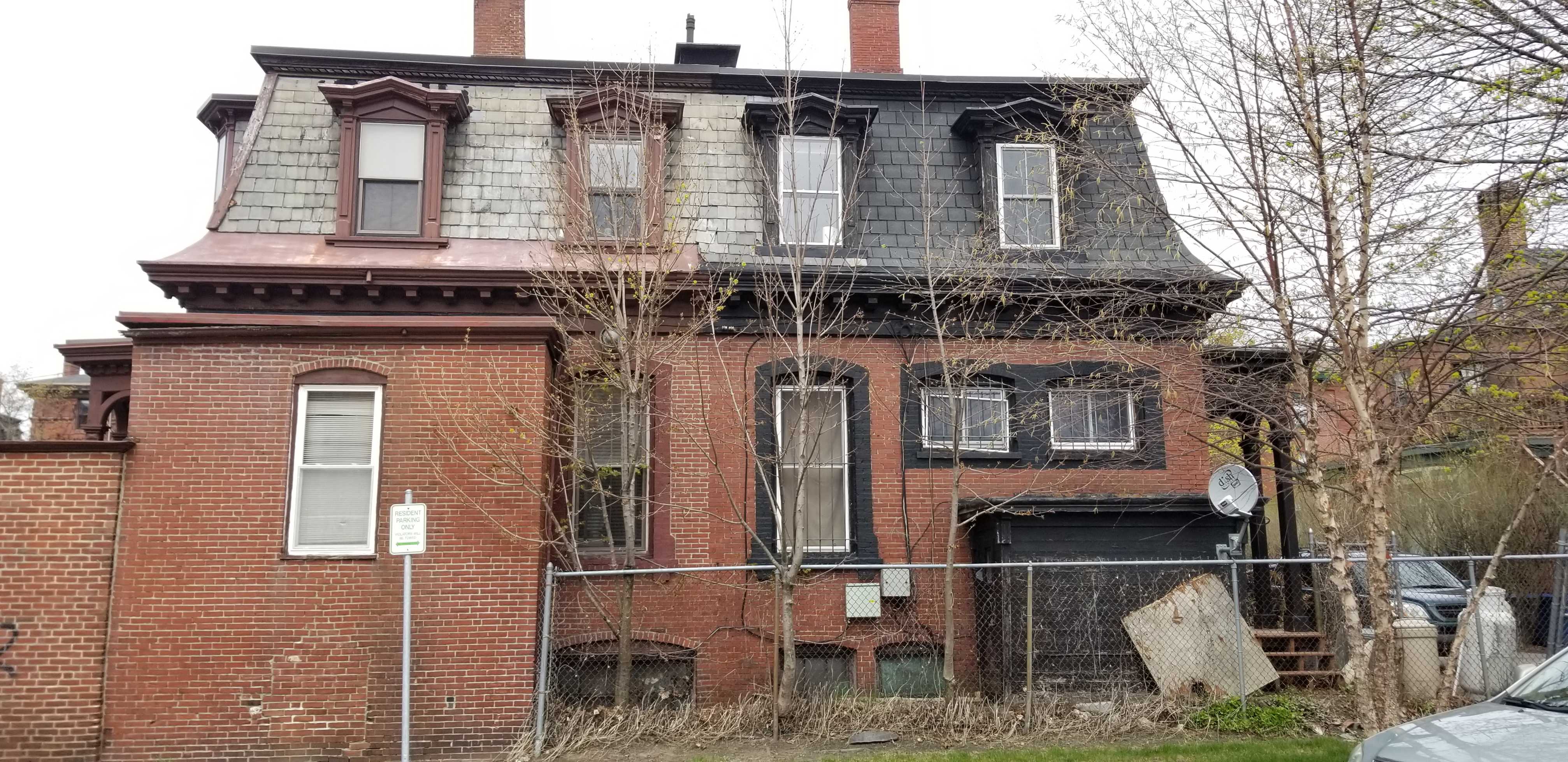 The ‘Winslow’ side at #14 is much simpler than its neighbor. One lone bay window at the first floor rear is the only break in the wall surface. This bay carries the details of the main façade bays. This wall may give us a good view of how the entire building looked originally. The remnants of whitewash show how the trim elements would have been highlighted against the unadorned wall of the main body. This would have given a much more lively feel than the current colors.