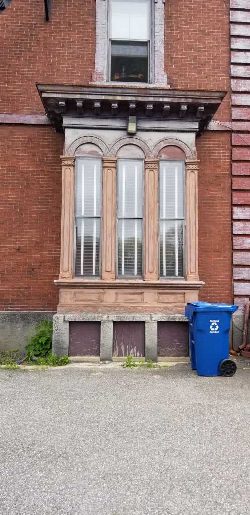 The garage at 14 Deering Street is a worthy carrier of the Remuddling banner. It was probably built in the ’60s or 70’s when the area was at its lowest point. The intersection of High and Congress Street, a block and a half away, was notorious for drug dealing and prostitution. It’s likely that vandalism or burglary caused the owners to desire secure parking. Regardless of when or why what was created was a ponderous lump of brick with no character or redeeming qualities.