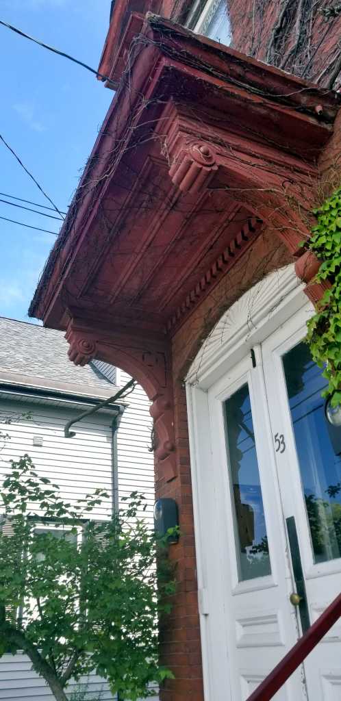 What Sarah and William built in 1881/2 is the classic ‘East Ender’ seen in countless iterations across the city. A gabled end faces the street. It’s divided into two unequal bays. The smaller bay contains the entrance and, usually, the stairwell for all the stories of the house. The larger bay carries the living area and usually has a projecting bay window on the 1st and 2nd floors. Our subject has all these characteristics but is a bit larger and, most importantly, made of brick. The vast majority of ‘East Enders’ were built of wood.