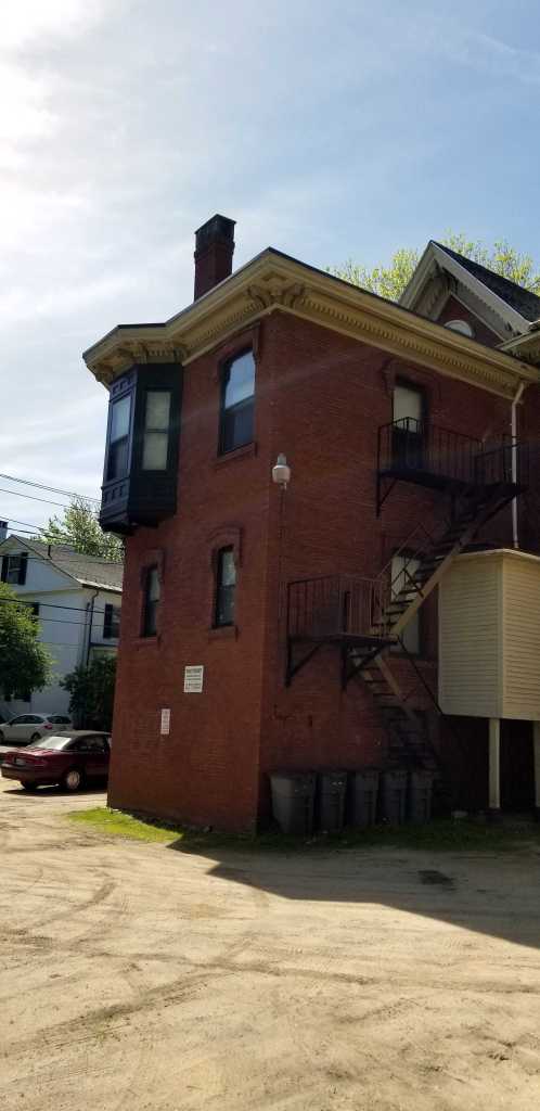 235 Brackett Street is made up of a wide block with a 3 story gable facing Brackett Street. It is one bay deep and intersects with a narrower block of the same height but 3 bays wide that parallels Bracket and presents a gabled end to Walker Street and its own driveway. It’s built of brick with a nicely tinted and tooled mortar adding to the quality of the masonry. Details are many and, as we shall see below, tell a tale of the various changes the house has undergone in its 150+ year life. There is a 2 story service wing on the rear that, mostly, carries the detailing of the main block.