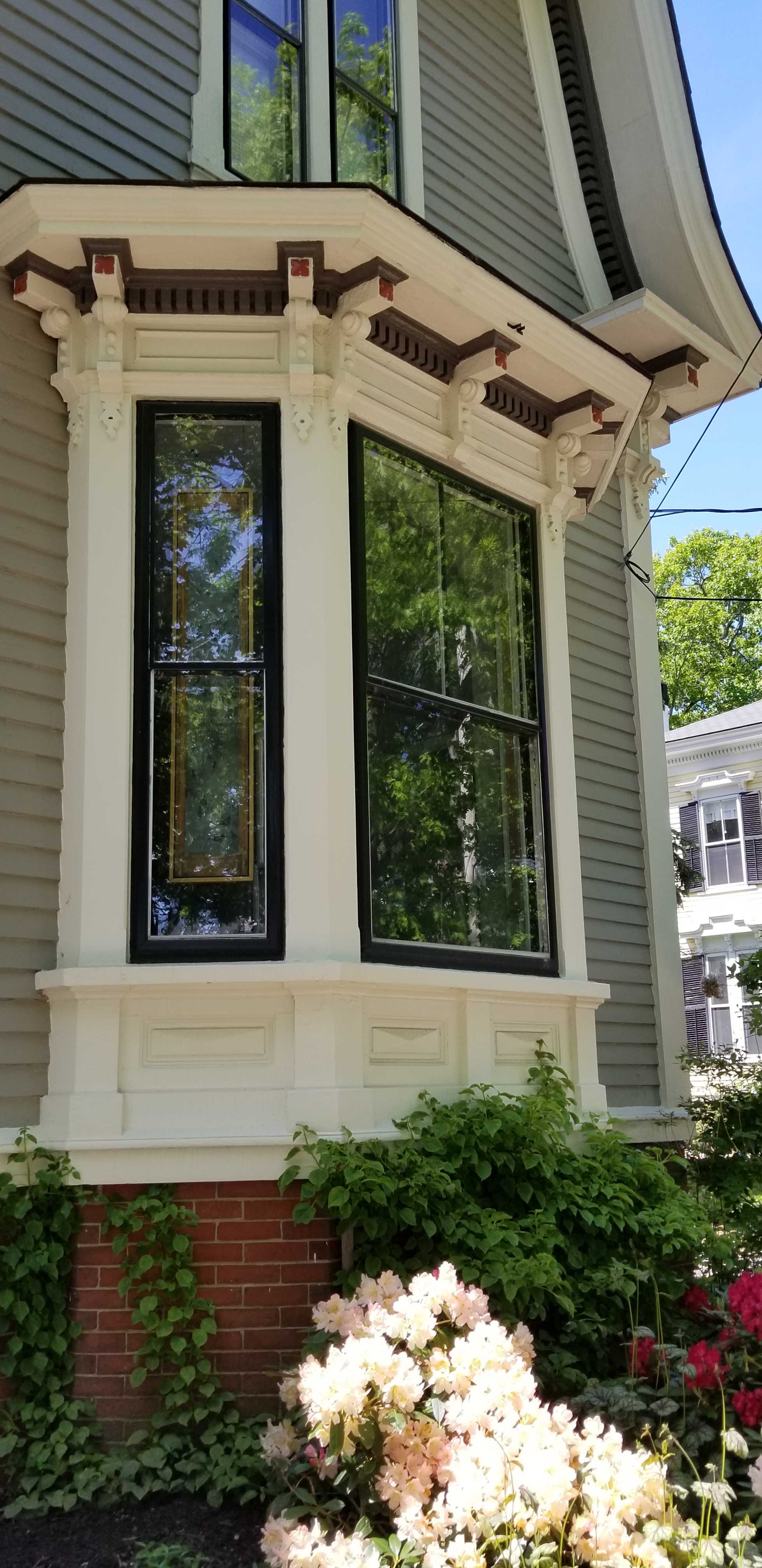 What the Smalls had built was a simple, but nicely detailed, Second Empire home in the urban mode. It’s one bay wide, two stories tall, and has a cross gable about two-thirds down its length. The trimmings are fairly simple but well executed. The finely scaled dentil molding capping the entablatures is a nice feature that emphasizes the horizontal nature of the composition. The building’s corners are set with plain pilasters that finish in some very interesting capitals that are made up of square brackets with cabochons on their faces, volutes in their interceese, and X motifs on their ends. The Mansard roof is very steep, a feature seen on many small Second Empire houses of the period in Portland. Kudos to the current owners and roofers for reproducing the patterns of the original slate roof in modern asphalt shingles.