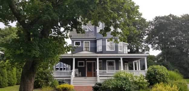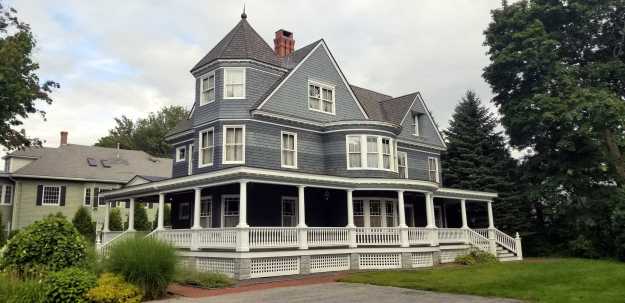 The house is a Queen Anne in form and detail. The mass is a rectangle nearly twice as deep as it is wide and is surrounded on all four sides with a verandah or piazza that varies from 4 to 9 feet in width. A curved bay on the southeast side and 3 sided bay on the front façade are the only breaks in the main rectangular body. The bays are carried into the second floor, although the side bay did not originally carry into the second floor. All this is capped cross-gabled roof with a large end gable on the southeast and twin gables on the northwest. The front bay becomes a turret on the third floor although this also is not the original arrangement. As seen in the 1924 tax photo, the bay was topped with a gable that overhung the clipped corners of the bay. The building is covered with cedar shingles in varied patterns.