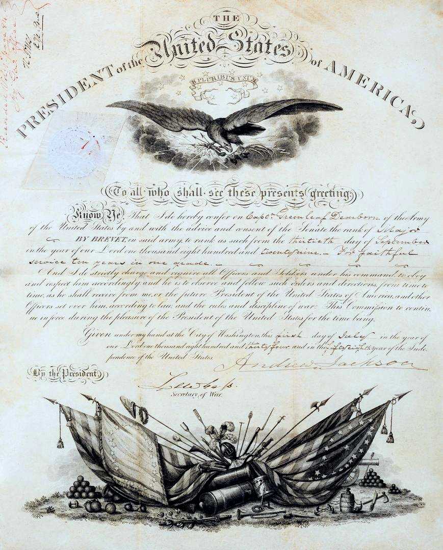 Official proclamation granting Greenleaf Dearborn the rank of Major General Brevet. 1829. Signed by President Andrew Jackson.