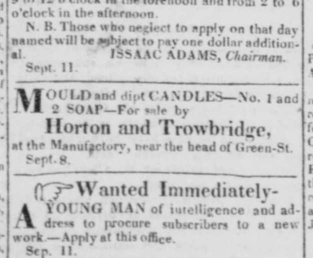 Elisha Trowbridge was a 4th generation descendant of Thomas and was born in Newton Mass in 1797. He married Margaret Stimpson in 1822 and settled in Portland that same year. Their first child, Edward Robbins, was born in 1823. They had 6 more children by 1837. Elisha worked as a tallow chandler making and selling candles with Rufus Horton then on his own in a facility on Portland Street. In 1831 he purchased a lot on the newly laid out Mechanic Street for $150 and built a house for his family.