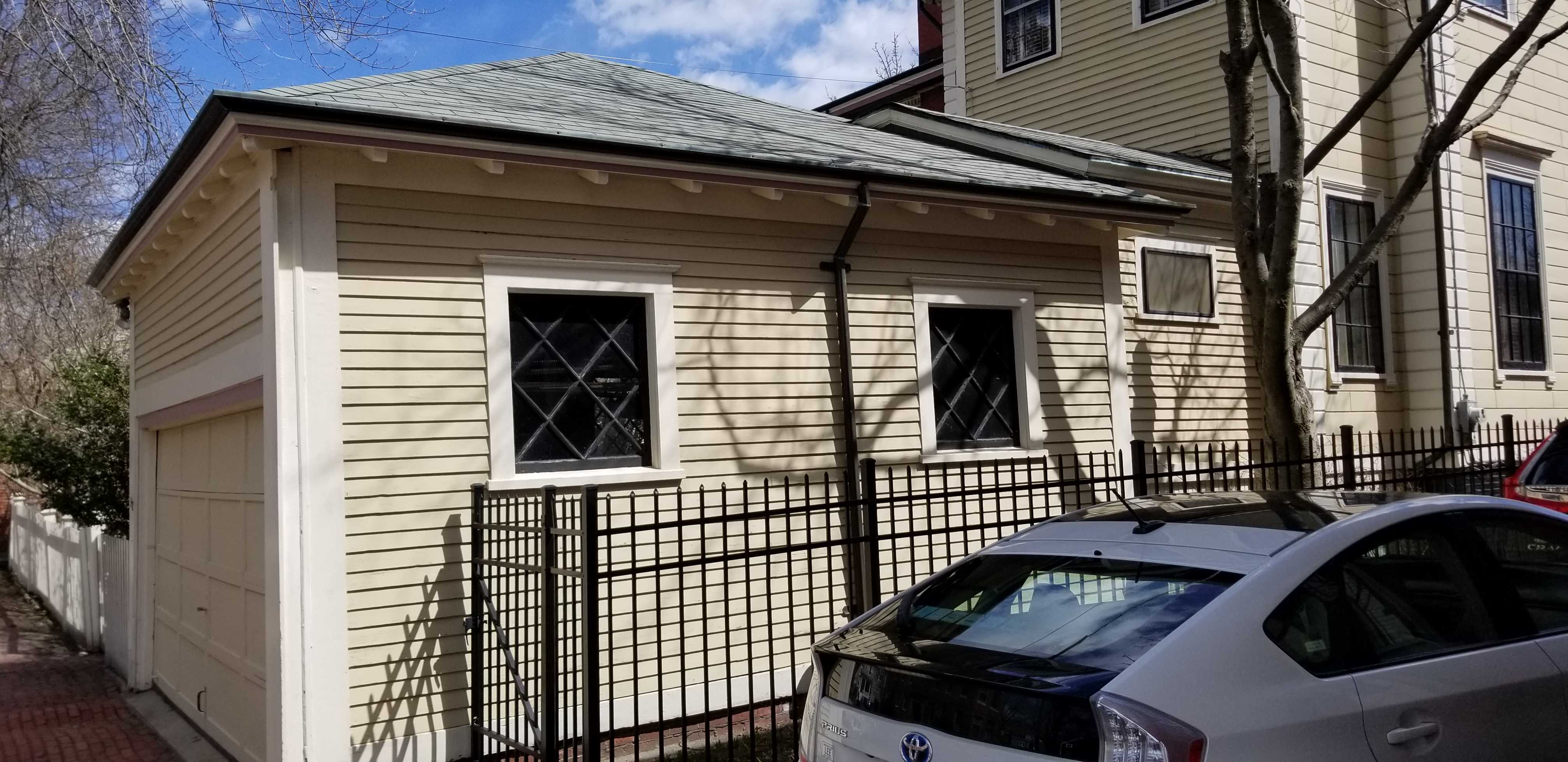 The garage for 357 Spring Street is accessed from Clifford Street. At 18 feet wide, it’s too narrow to allow 2 vehicles to park and open any doors. Looking at the sketches for the 1924 and current tax information, we can see the current garage is 2 feet deeper now. Also, the structure connecting the garage to the house wasn’t there in 1924. As it and the garage share siding and trim, I am of the belief that the garage was rebuilt when the connector was built. The windows may have been in the earlier structure.