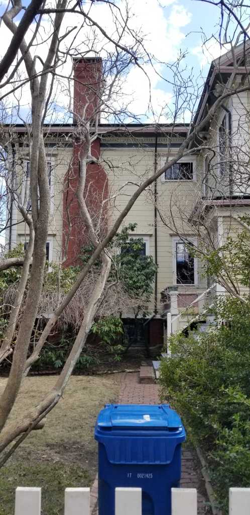 Benjamin built a substantial house which is well sited on its lot. It’s about 25’ x 70’ with a 20’ x 25’ extension on the northeast side. There are plenty of porches, some screened, covering much of the northeast to southwest sides. It is 2 stories high with a 3rd in the attic. The building is quite tall. The high pitched roof, stacked bays, quoins and deep windows enhance the vertical feel. The windows are set in frames with modest trim on the sides but having a full entablatures above. The walls have no belt lines and terminate in full entablatures with dentils. These are overlaid with brackets.