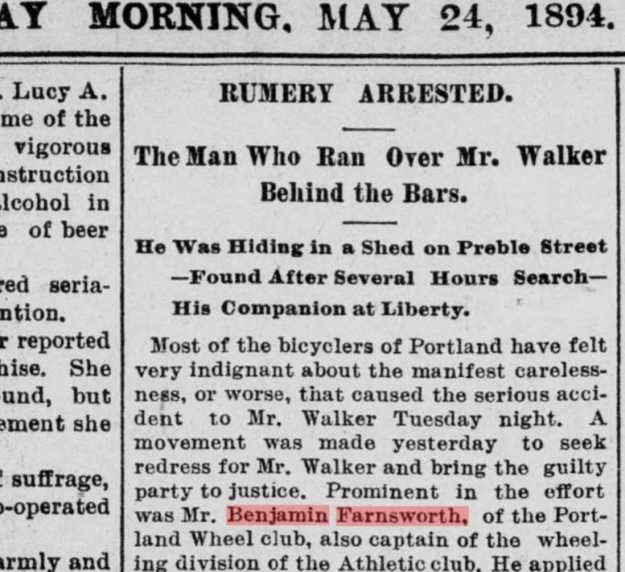 Newspaper report from May 24, 1894 about Ben Farnsworth and his efforts to locate the person believed to have hit and injured a fellow wheel man. Library of Congress.