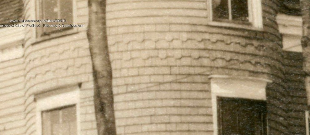 Detail of 1924 tax photo for 1040 Ocean Avenue showing original patterned shingles on the turret along with windows and trim since changed. Maine Memory Network