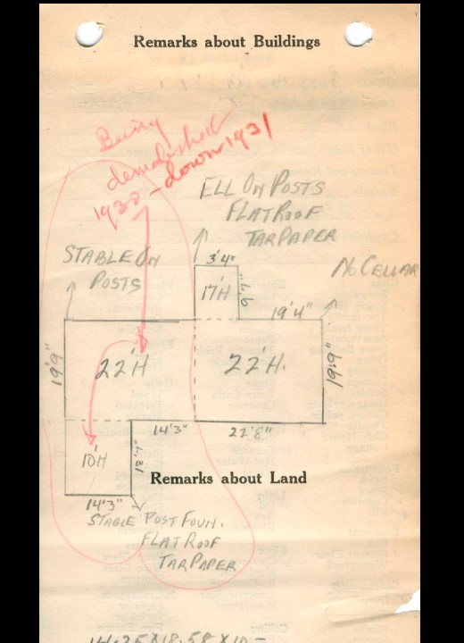 The current tax assessors data says it was built in 1790. This is certainly way, way off. Shattuck’s deed of 1857 states he purchased land and no buildings are mentioned. In 1924, the assessment data gave a build date of 1900 and that’s more believable. The 1924 information is helpful again in that the sketch of the house shows it as originally built and is annotated to show the changes made and when they were made.