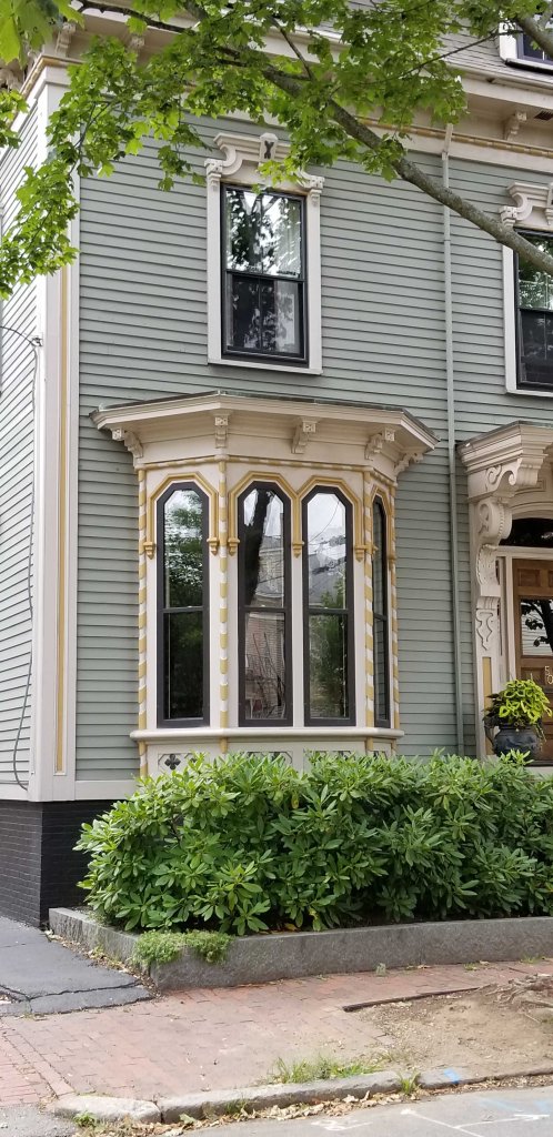 The bay windows showcase Tenney’s fascination with ornamental detail used to accentuate the basic forms of his buildings. The faces of the bays have quatrefoil appliques and the corners are faced with ribbon moldings. The window sill is a hefty unit with a deep projection and rounded face. The ribbon moldings from below are carried up the corners of the bays and turn to cap the bay faces. The upper parts of the windows are surrounded by half-round moldings that spring from what appear to be single candle sconces. Above all this is a truncated entablature that transitions into a strongly projecting cornice which is carried on brackets showing quatrefoil emblems. All of this ornament was available from a few different lumber and molding merchants in Portland at the time.