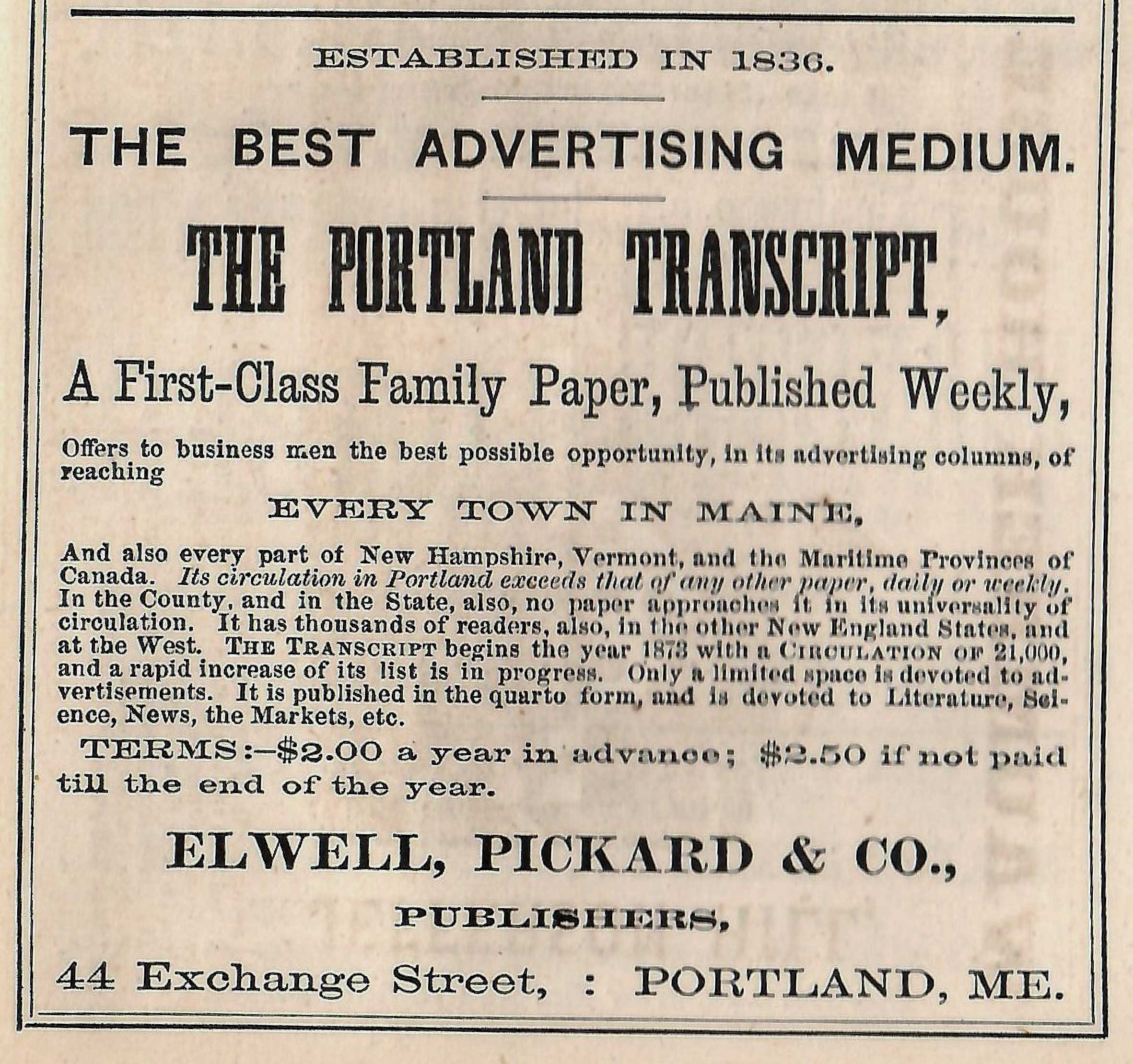 Edward was born to Charles and Margaret Elwell in Portland in 1825. Charles was a mason and the family lived in a couple of locations on the peninsula, mostly on Winter Street, as Edward and his sister Margaret grew up. He was an early graduate of Westbrook Seminary. He then started working in the printing shops of the city and worked his way up thru the ranks. In 1845 Edward, along with Charles & Samuel Pickard, merged 2 small newspapers to create the ‘Portland Transcript’. This was a literary publication that included book excerpts and reviews, travelogues, poems and essays, letters from foreign correspondents, and more. The partners published the weekly until 1885.