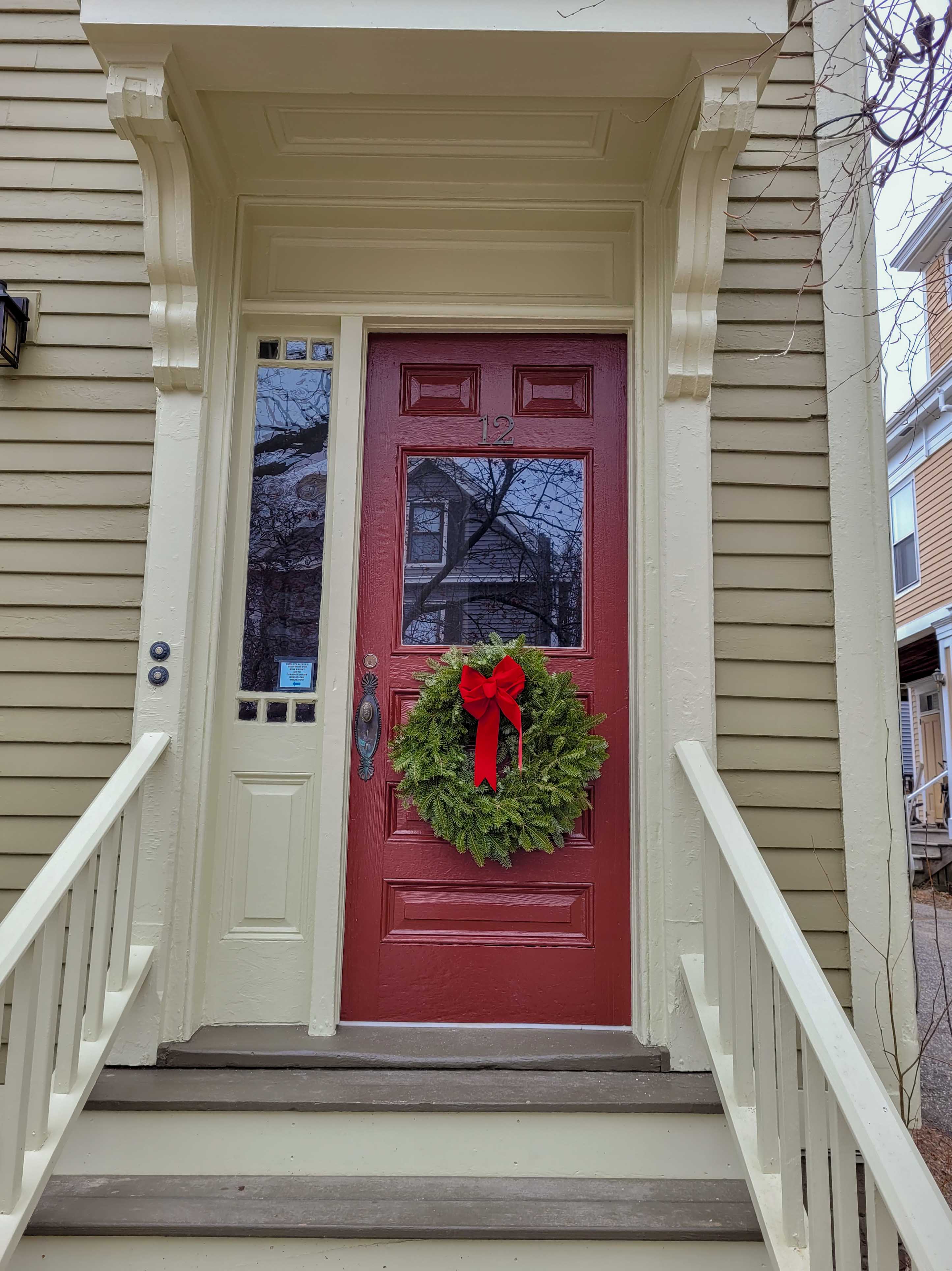 In its windows and door arrangments, 12 O’Brion follows the common ‘East Ender’ form with the entry portico on one side, usually the right, and a bay window on the other side. The bay is square and tall and is well molded. Square pilasters with reeded capitals separate the windows. The entry portico is under a roof held by hefty brackets. The brackets are made of two smaller units combined with a fillet molding between them. The fillet is held back from the plain of the brackets creating a shadow line and reducing the visual weight of the brackets when seen from the street. The entry door looks very similar to the unit in the 1924 tax photo and maybe original. Given the wear in the stoop, that looks like it has been there for quite a while.