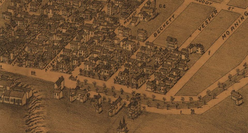 12 OBrion 1876 BE Next → 12 Beckett Street on the 1876 Bird’s Eye view of Portland. Library of Congress.