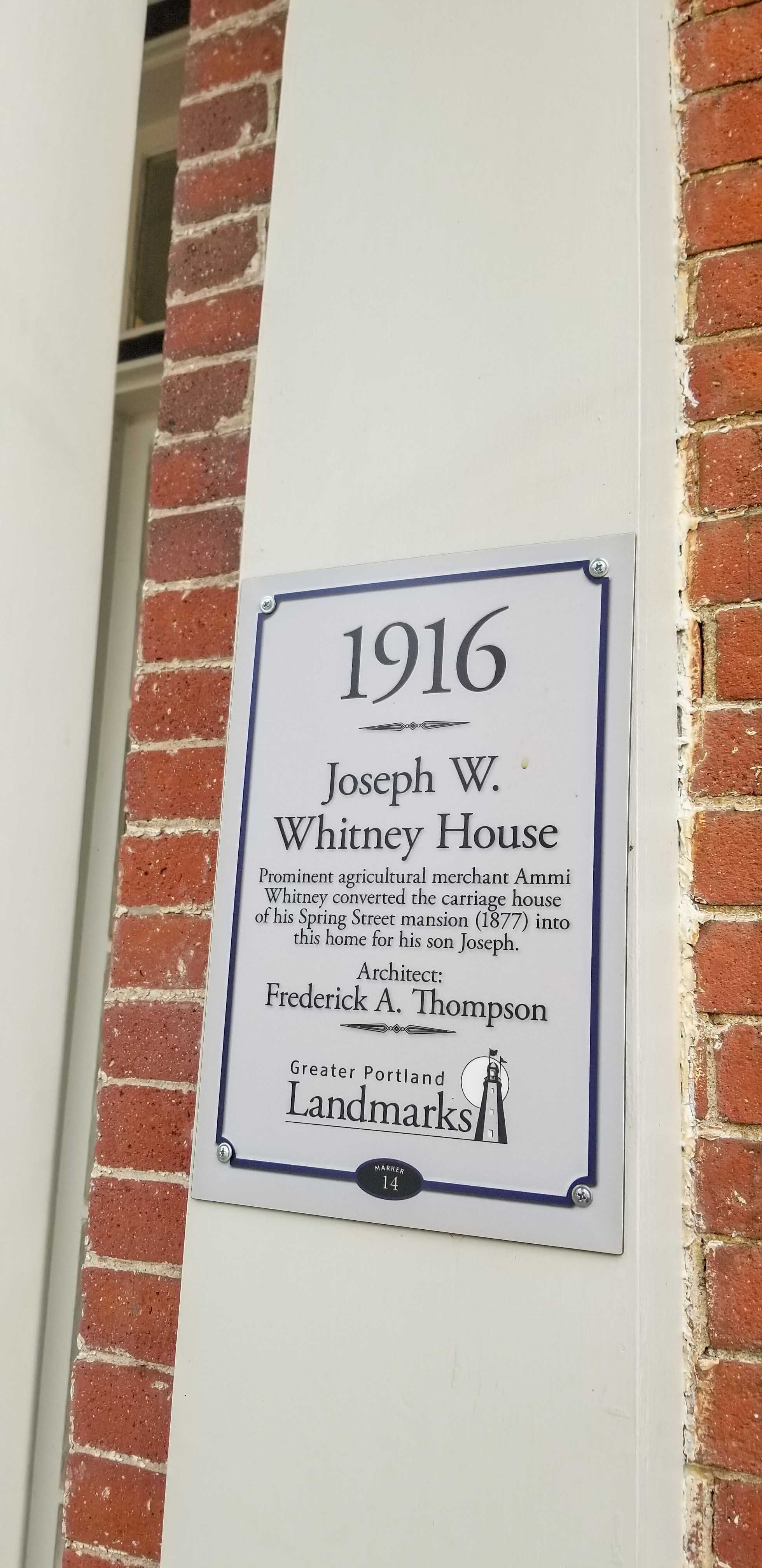 About the same time the carriage-house was built, 1877, Ammi and Emily Whitney’s last-child, Joseph Walker, was born. Joseph attended Portland schools and was president of his high school graduating class. He then attended and graduated from Bowdoin College. In 1908 he married Bertha Lenora Stewart of Portland. They initially lived on Whitney, now Marshall, Street in a house Ammi had built as an income property. Note: Ammi Whitney owned and built a lot of income property. In 1913, their only child, Joseph Junior, was born.