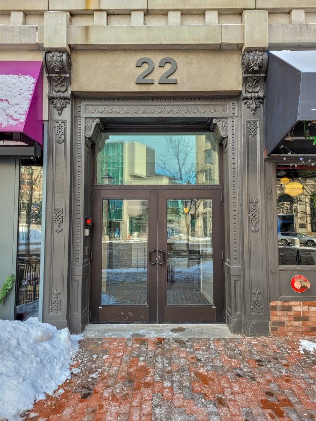 Cast-iron had fallen out of favor to a great extent by 1913 so the amount used on 22 Monument Square is unique. The street level is of cast iron with the entrance showing great detail. Above this is a granite lintel with a heavy dentil detail. The use of granite in storefront lintels has a long history in Portland going back to the 1820s. The upper levels are divided by brick piers. The second level has 2 windows in the middle bay with three windows in the outer bays. The second story is capped by a band of terra-cotta. The upper 4 levels have 3 window bays of 3 windows each. The window bands are divided by cast-iron spandrels that integrate the pilasters that divide the window units. The windows of the outer bays are often called ‘Chicago Windows’ and provided a large amount of glass area. The cornice is richly overlaid with terra-cotta of various shapes and forms.