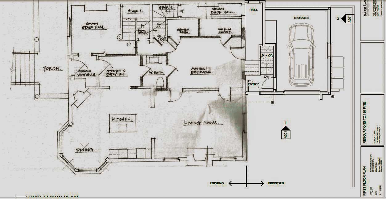 in 1968, Stanley Dienst sold 190 Pine Street to a widow named Dorothy Humphries. She resided here until 1977 when she sold it to a physician from Freeport named Rebecca Hotelling. She ran her practice here until 2007 when she sold it to another physician named Heidi Larsen. The current owner purchased it in 2014. In 2020, they submitted a plan to replace the tired, not original, garage facing Chadwick Street. As the home is in the West End Historic District, it will undergo an intensive design review. Included in the submission plan is a plan for the first floor reproduced below.