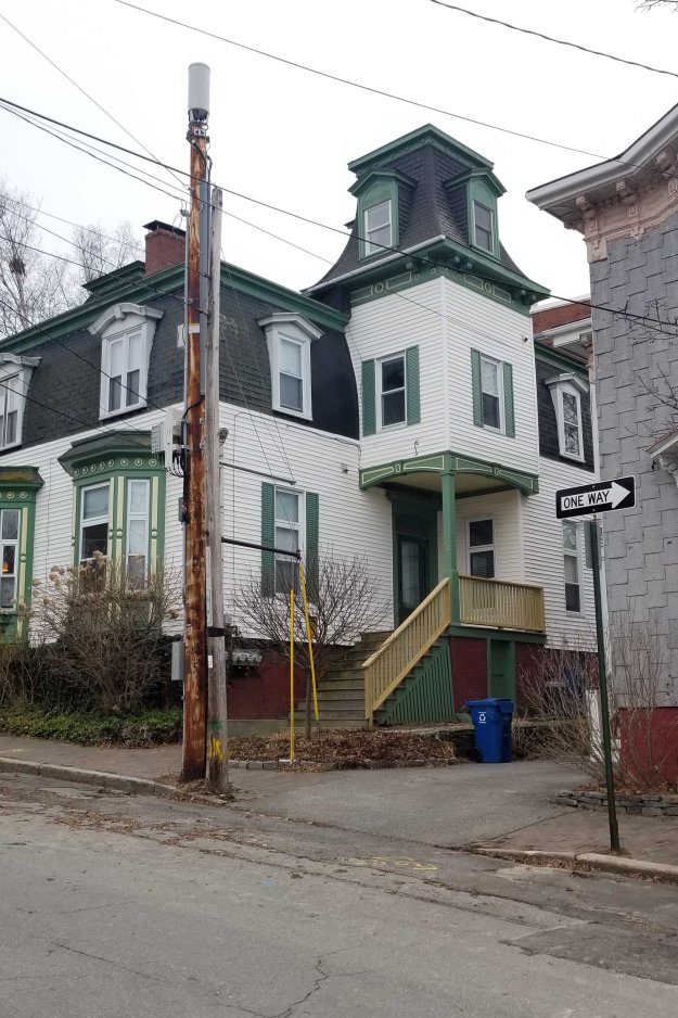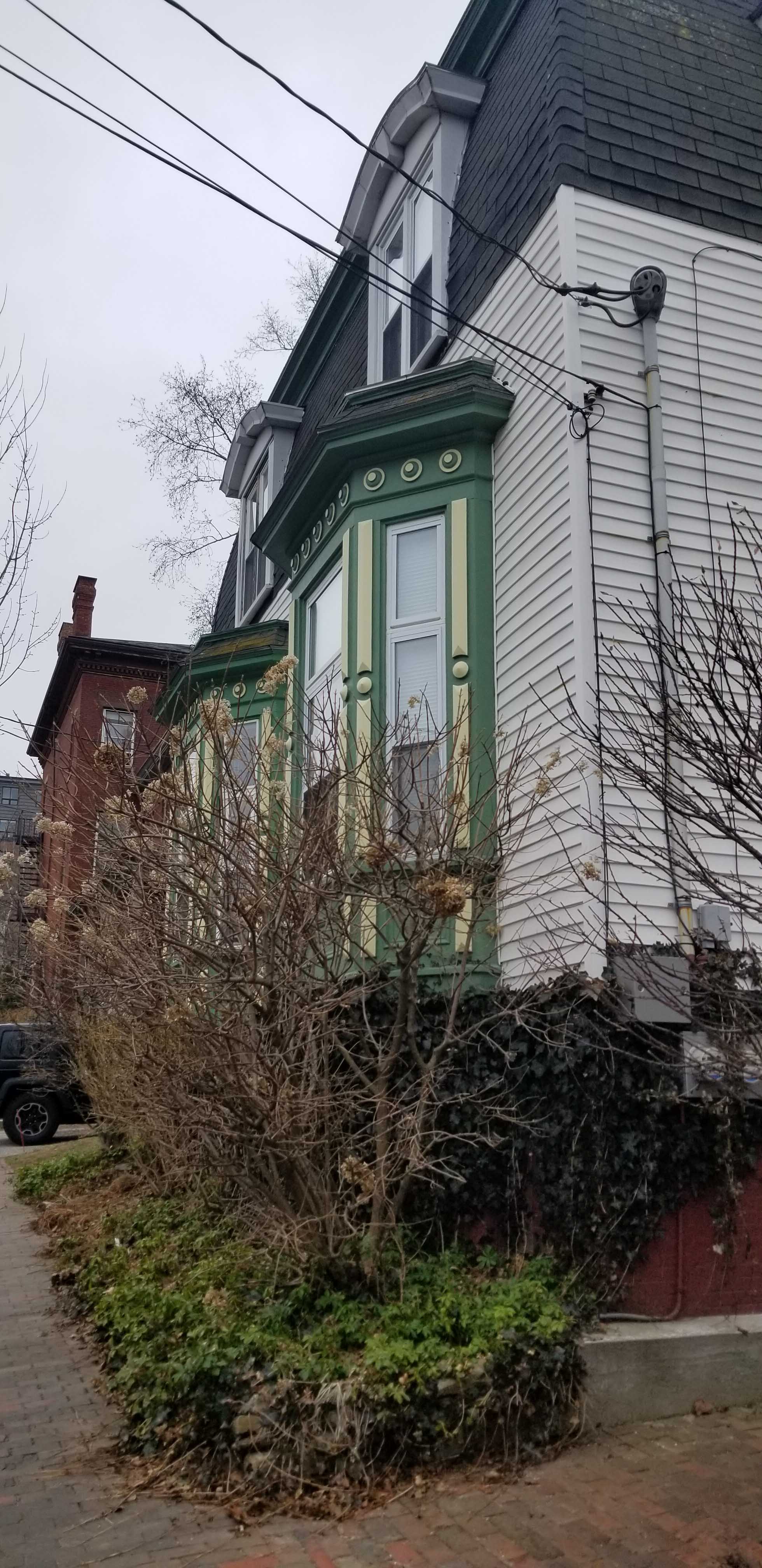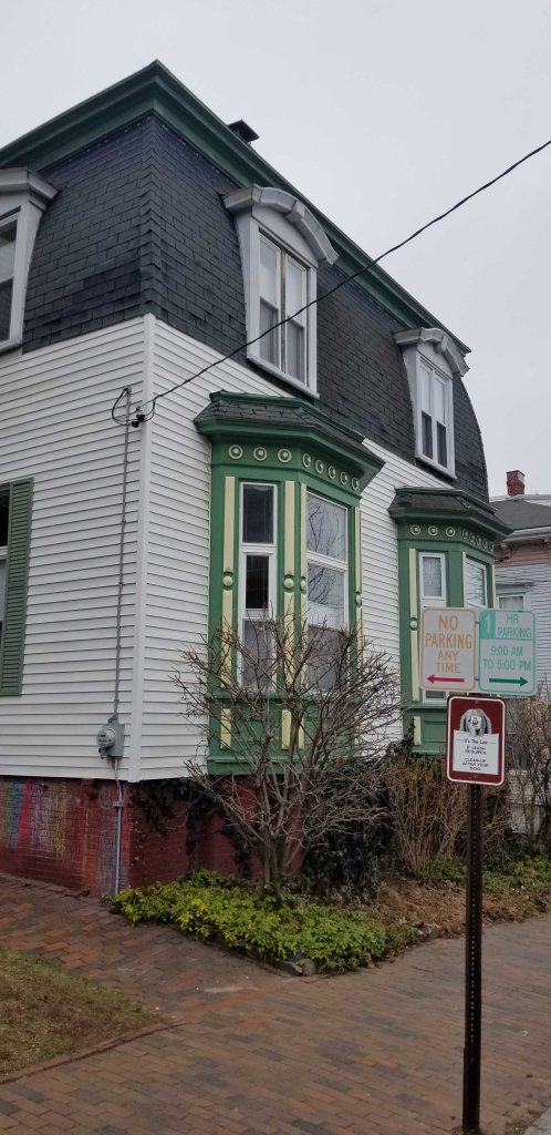 Mr. Smith really went to town on this one. You don’t often encounter convex Mansard roof forms in residential architecture. It is a shape mostly confined to governmental buildings like the Belvederes on the Customs House, and, less often, in commercial buildings such as the Woodman Block on Middle Street. Here on Avon Street, they are mashed together with concave Mansards on the ‘towers’ over the entries into one exuberant mass.