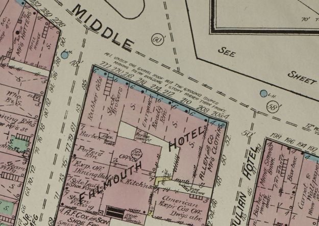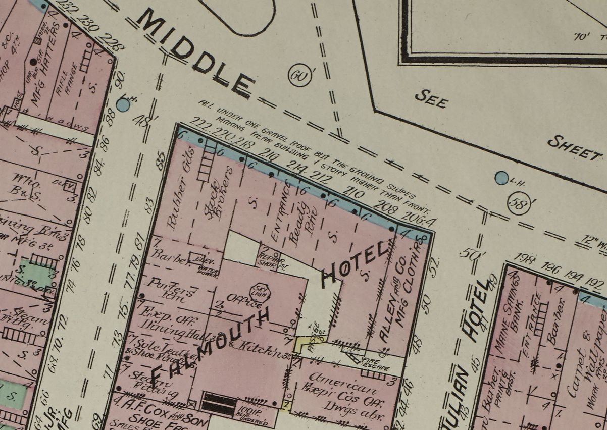 The Falmouth Hotel on Middle Street showing John Pike’s barbershop at 7 Union Street on the 1886 Sanborn Map. Library of Congress.