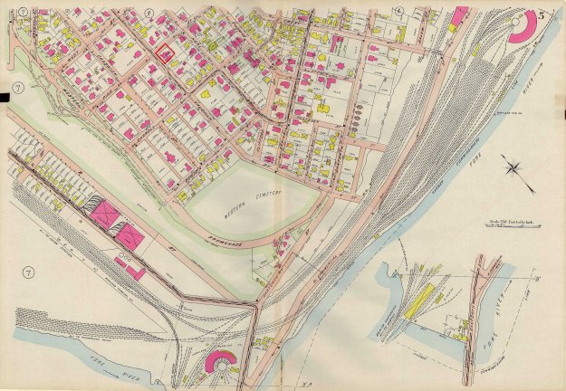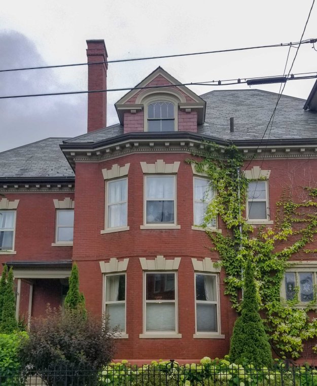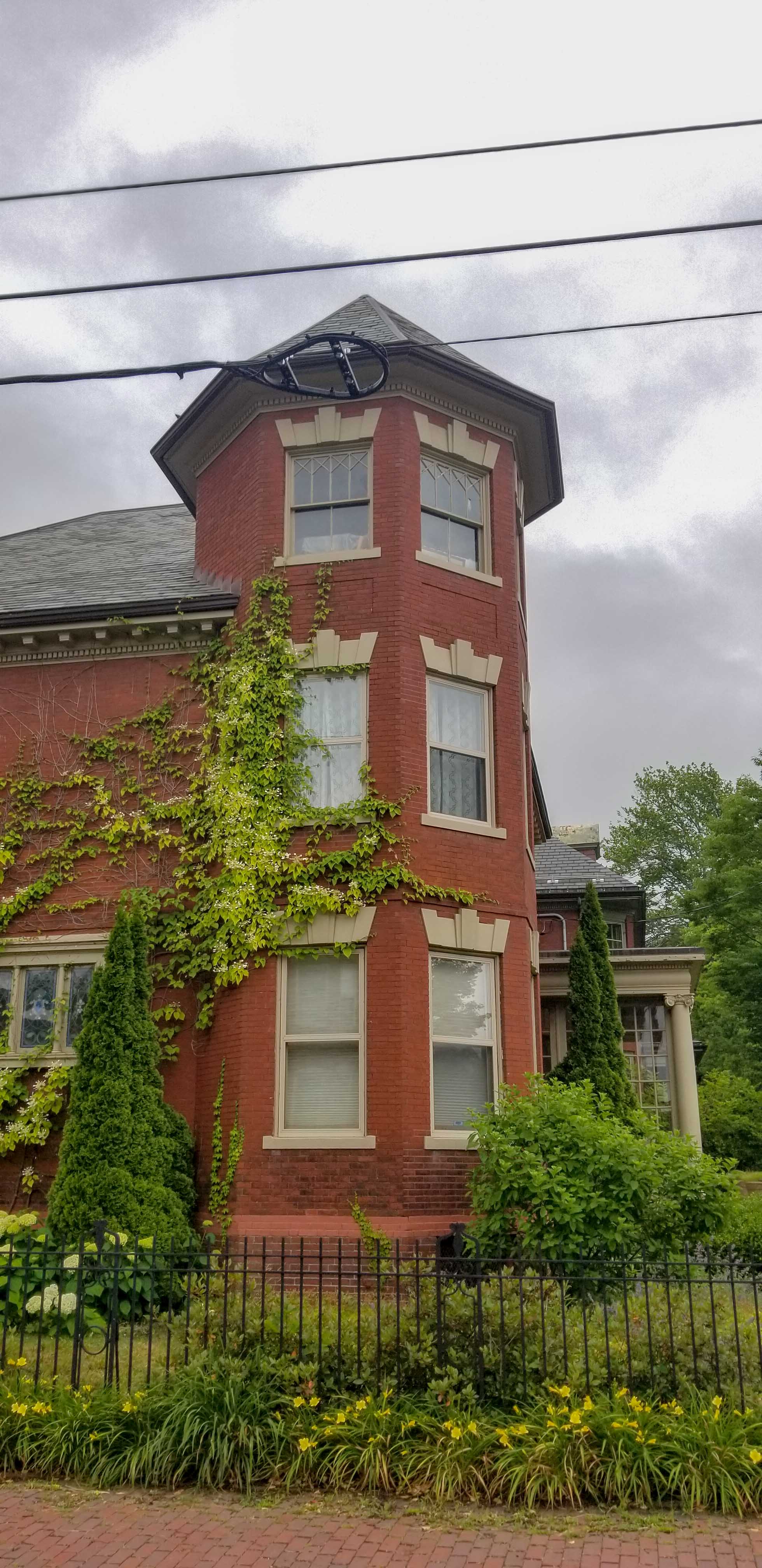 The house is a 2 story rectangle measuring 35′ on Vaughan St and 41′ on Pine Street. There is a 2 story extension measuring 21′ x 24′ on the east end facing Neal Street. The turret on the corner shows a third floor in the garret. The brick is a salmon color and the windows are decorated with over-scaled Colonial Revival lintels of concrete. The roofing is slate. We will look at details further on.