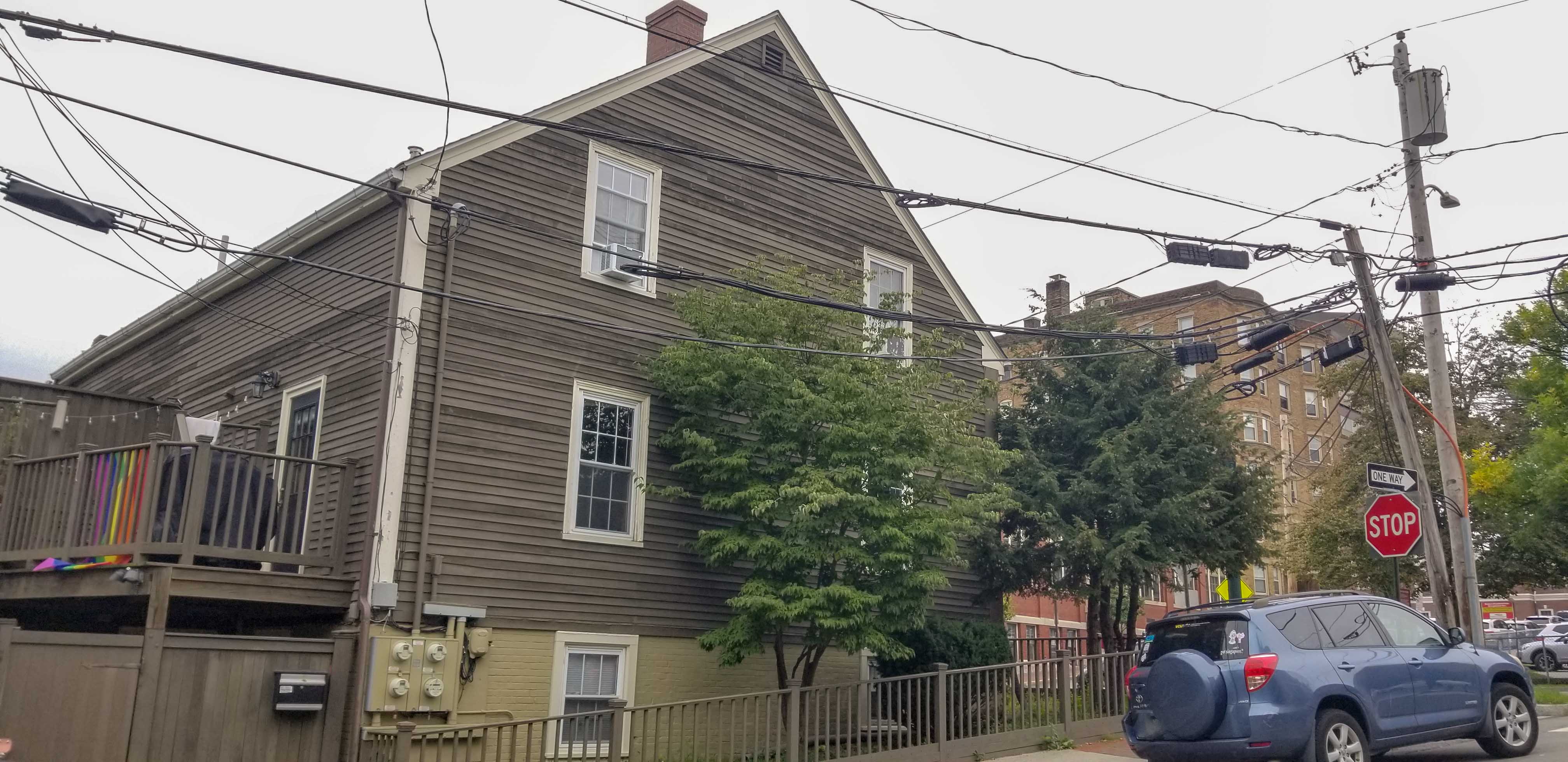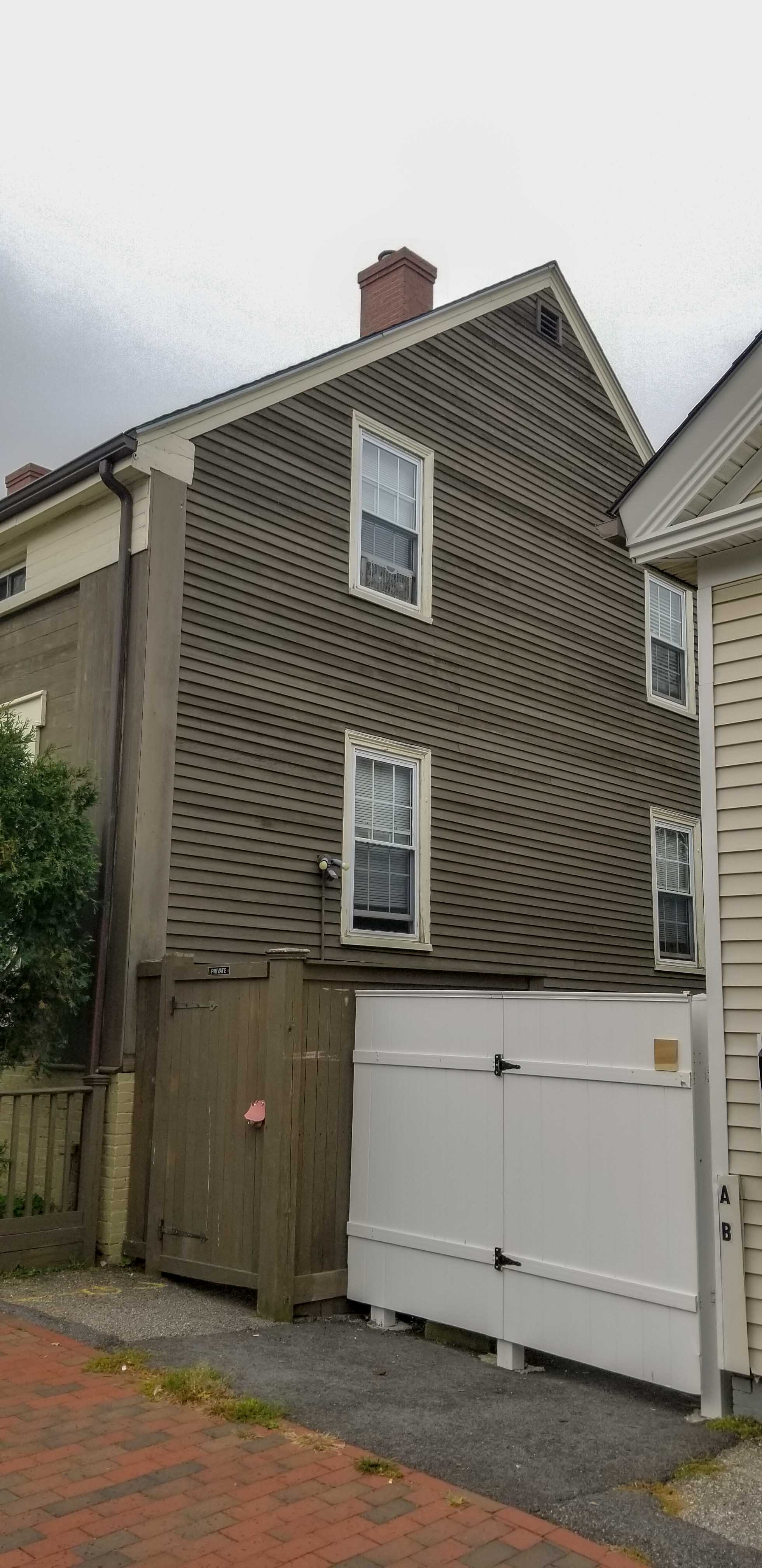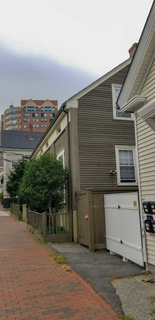 The house measure 41′ on the street and is 31′ deep. The lot is about 51′ square with an odd 10′ x 11′ protrusion running behind #5 Hanover Street. The southwest corner of the building is on the property line. The house has a full first-floor with a second-floor in the garret. Details are very similar to 2-3 Mechanic Place and 88-90 Sawyer Street. The entries are set into the building in the ‘Portland mode’. The detailing is simple yet effective. Matched siding is overlayed with similarly matched boards running vertically emulating columns. They support a flat architrave into which small sliding windows aligned with the openings of the first floor are set.