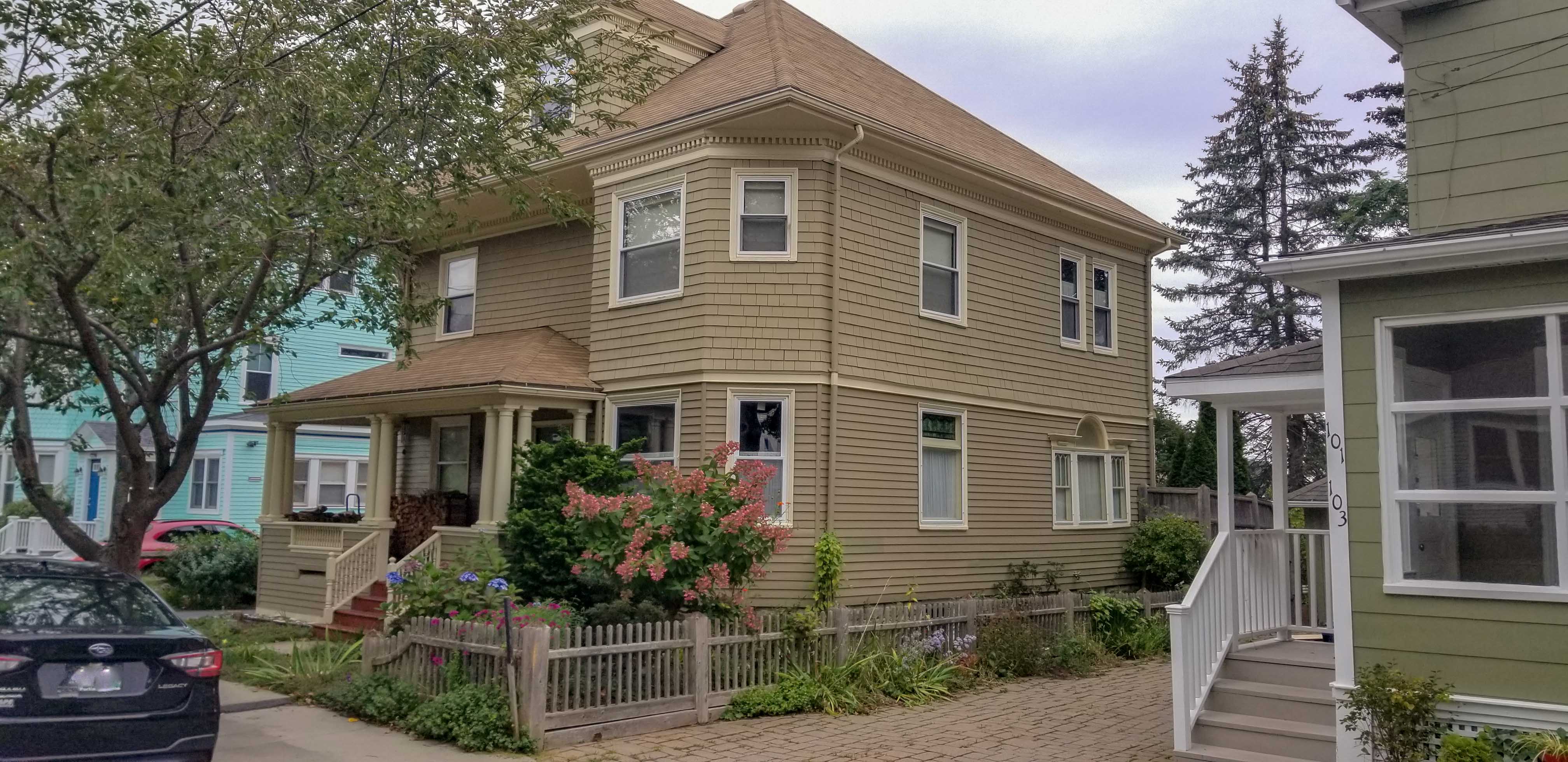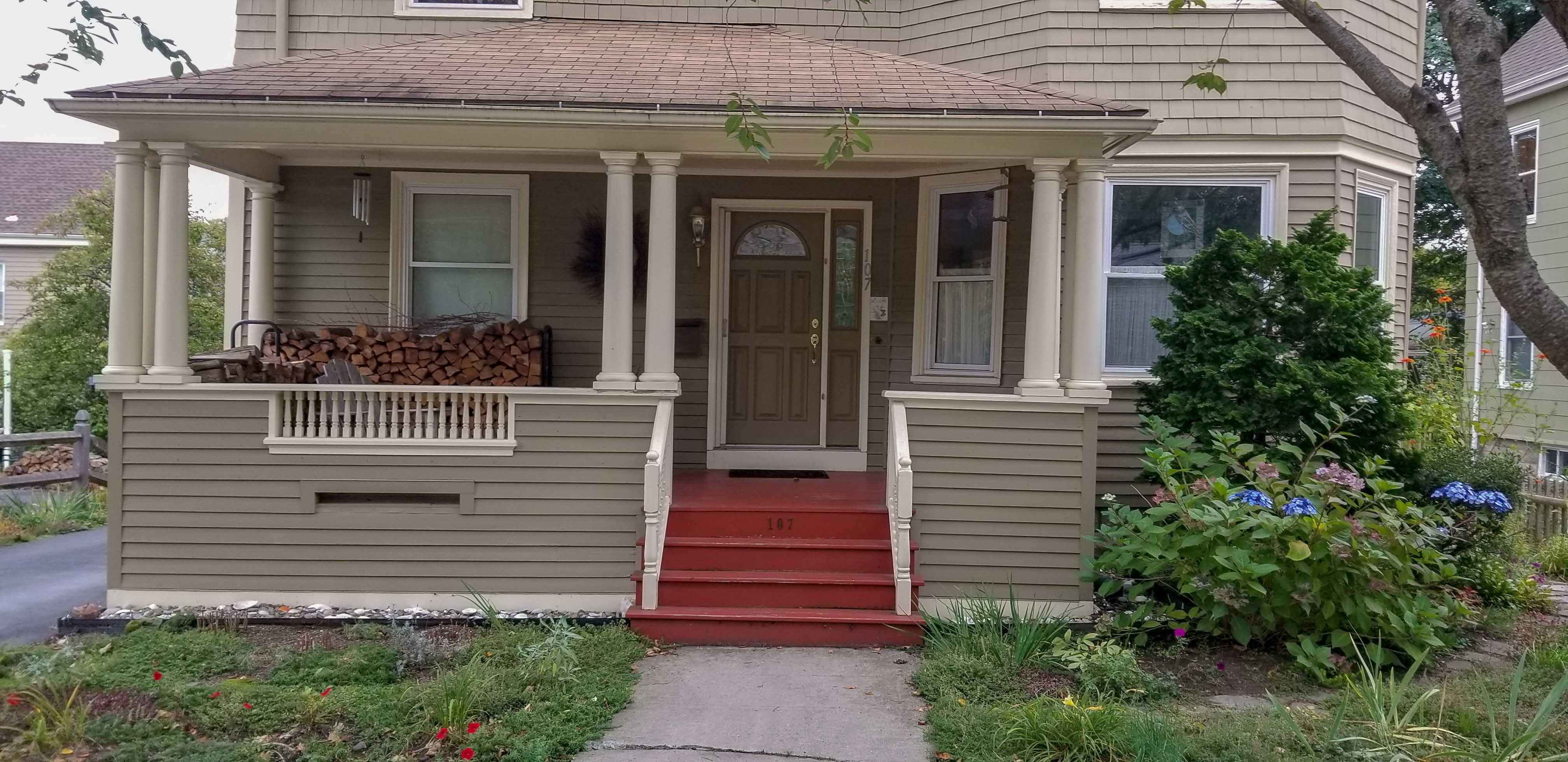 107 Beacon Street measures 32′ on the street and is 30′ deep. The bay is 4′ deep and the porch is 8′ deep by 22′ wide. There is an attached garage, a pair of ‘bump-outs on the rear, and a substantial deck. The pair of dormers leads me to believe there is living space in the garret although I cannot confirm this.