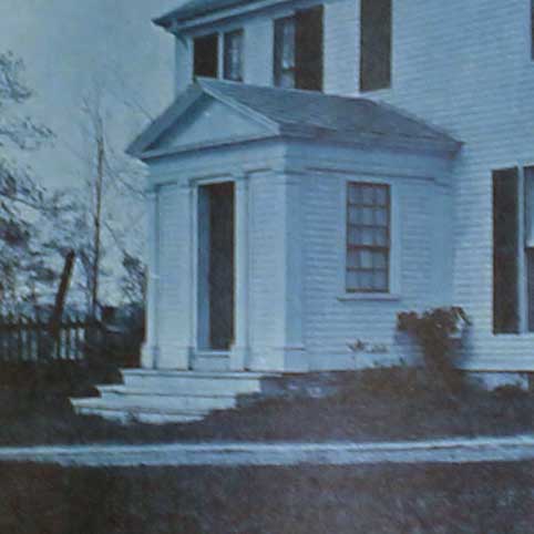 Judging from the existing entry and photographic evidence, I do not think the enclosed entry is original to the house. The corner pilasters and entablature are not repeated on the main structure. Neither is the closed pediment. The historic photos show even more detail with fully defined pilasters on the corners as well as on either side of the entry. Again, none of this detail is to be seen anywhere on the main body of the house. I would guess the build date was around 1805-1810 and the inspiration was Asher Benjamin.